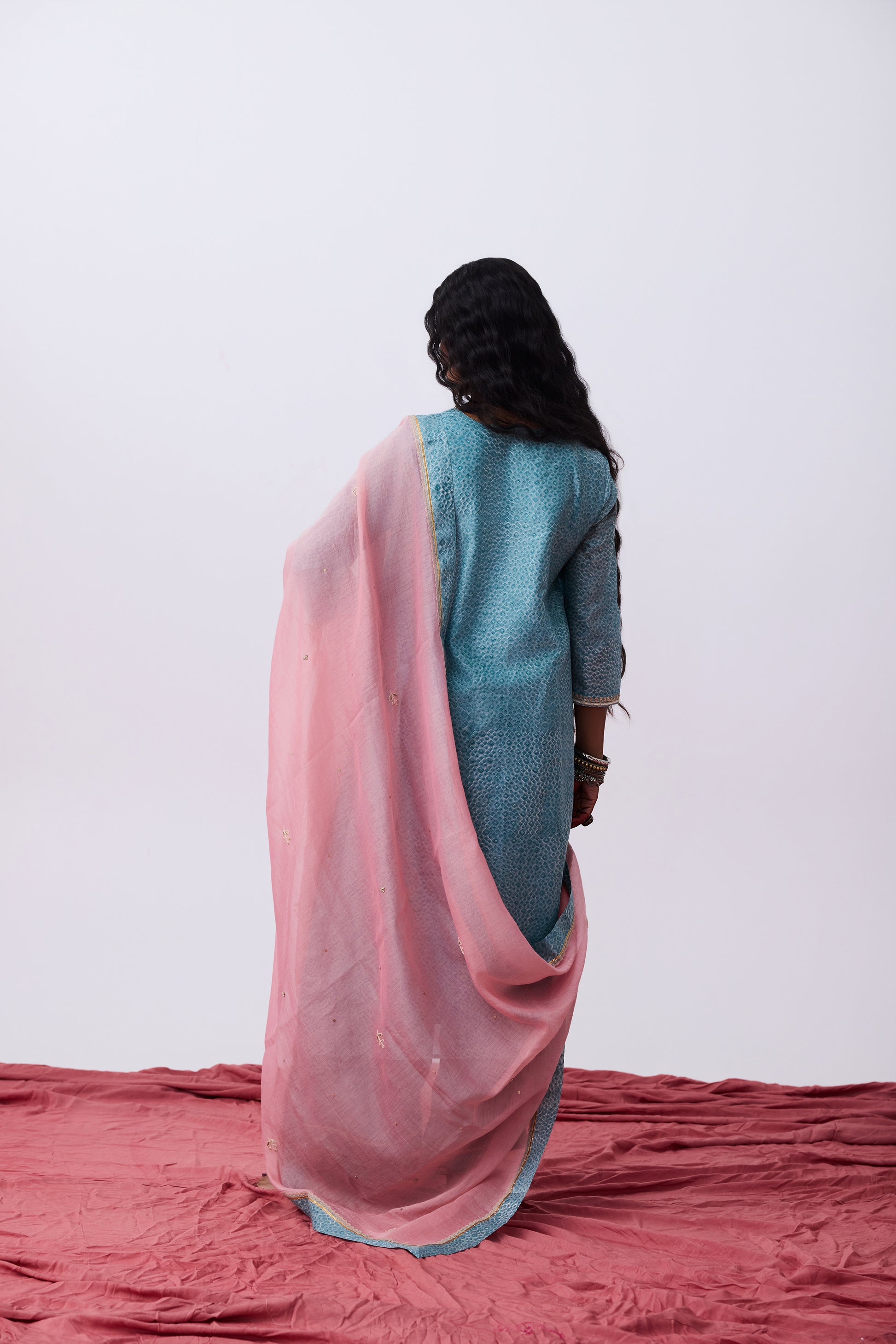 DESCRIPTION: Dupatta is in chanderi mul has hand embroidery and machine embroidery with contrast border and lace all over.