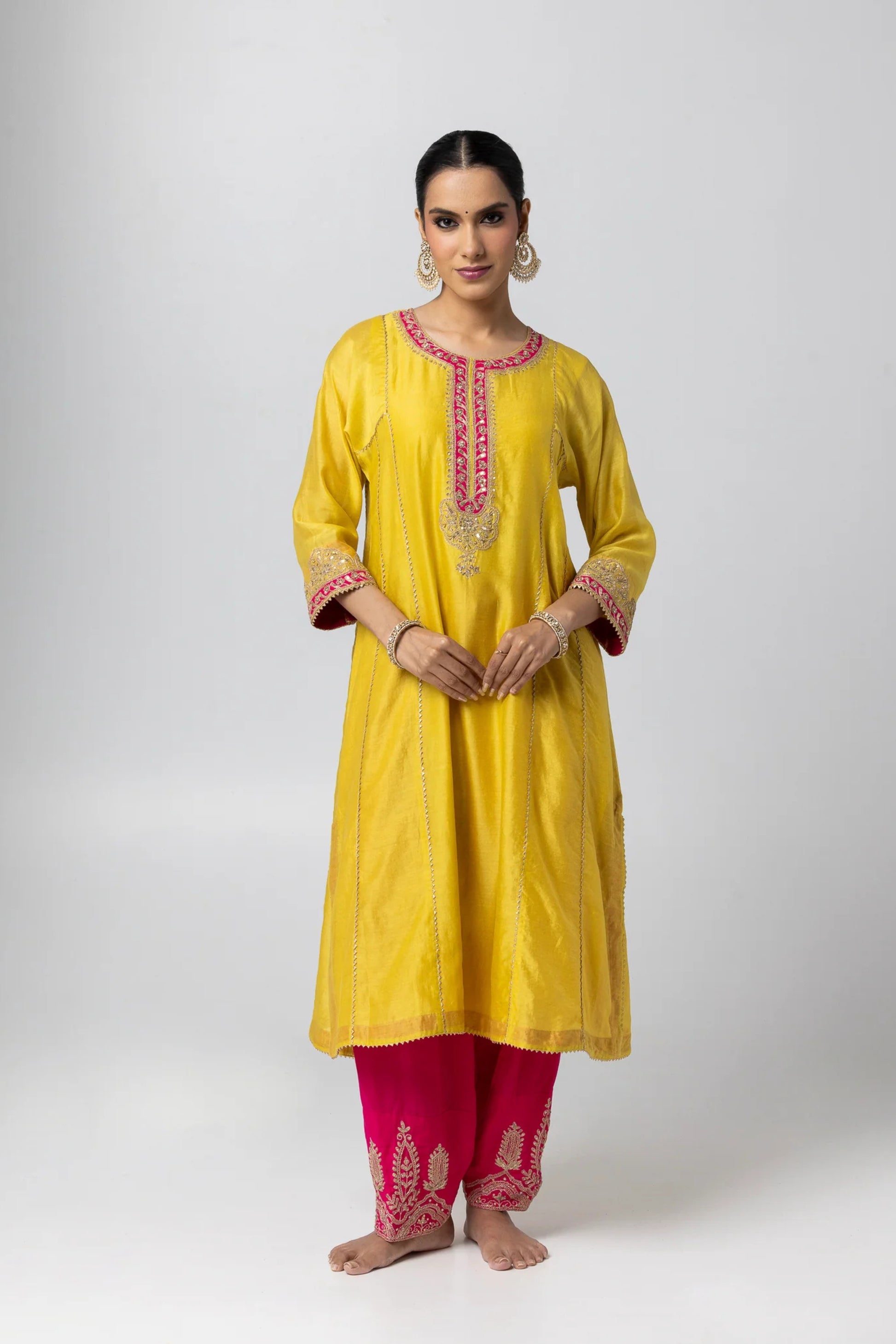 DESCRIPTION: Yellow pure silk chanderi long kurta has round neck with hand zardozi and machine dori embroidery on contrast fabric. Sleeves are loose fit with hand zardozi and machine embroidery on contrast fabric at the hem. kurta comes with separate lining.