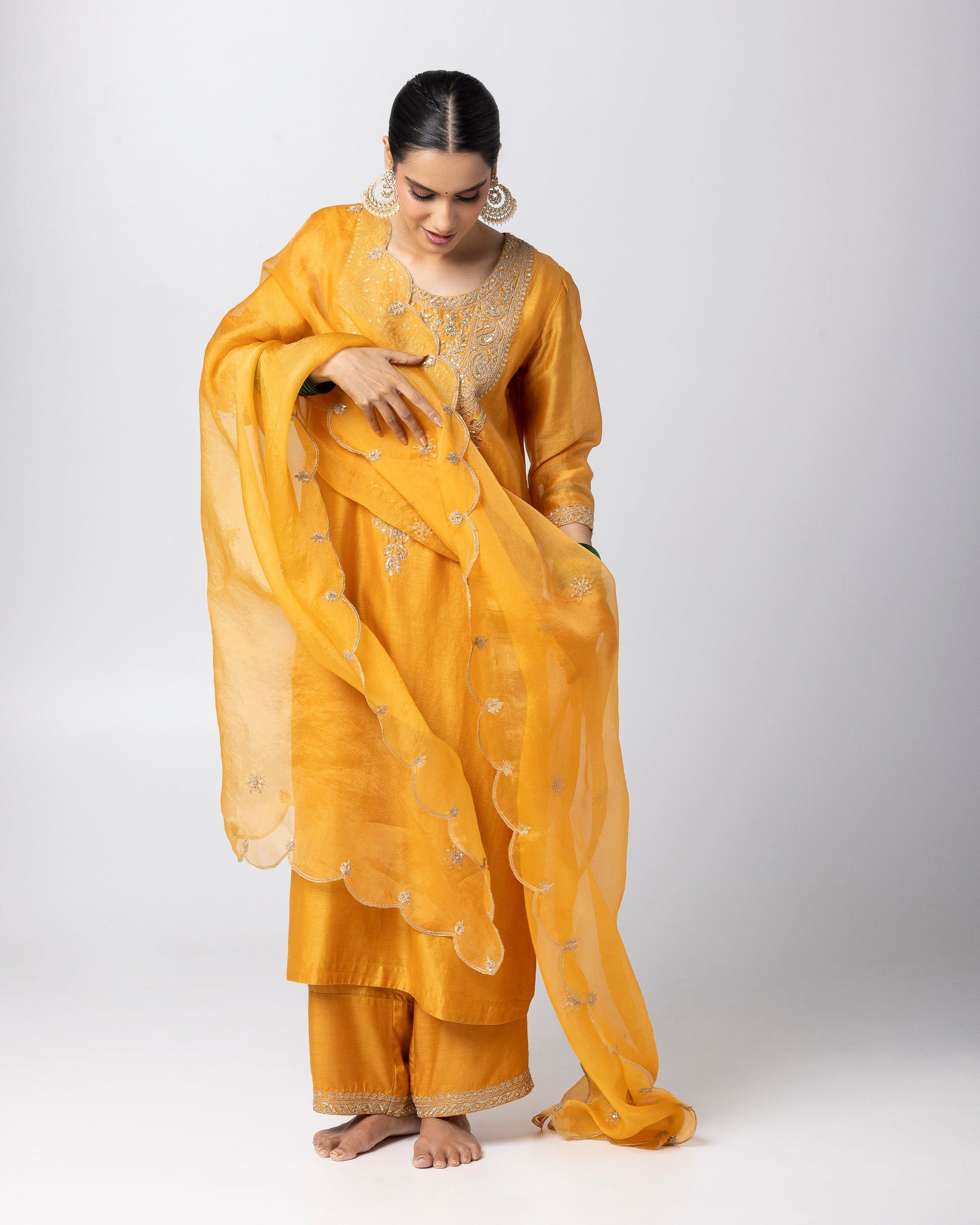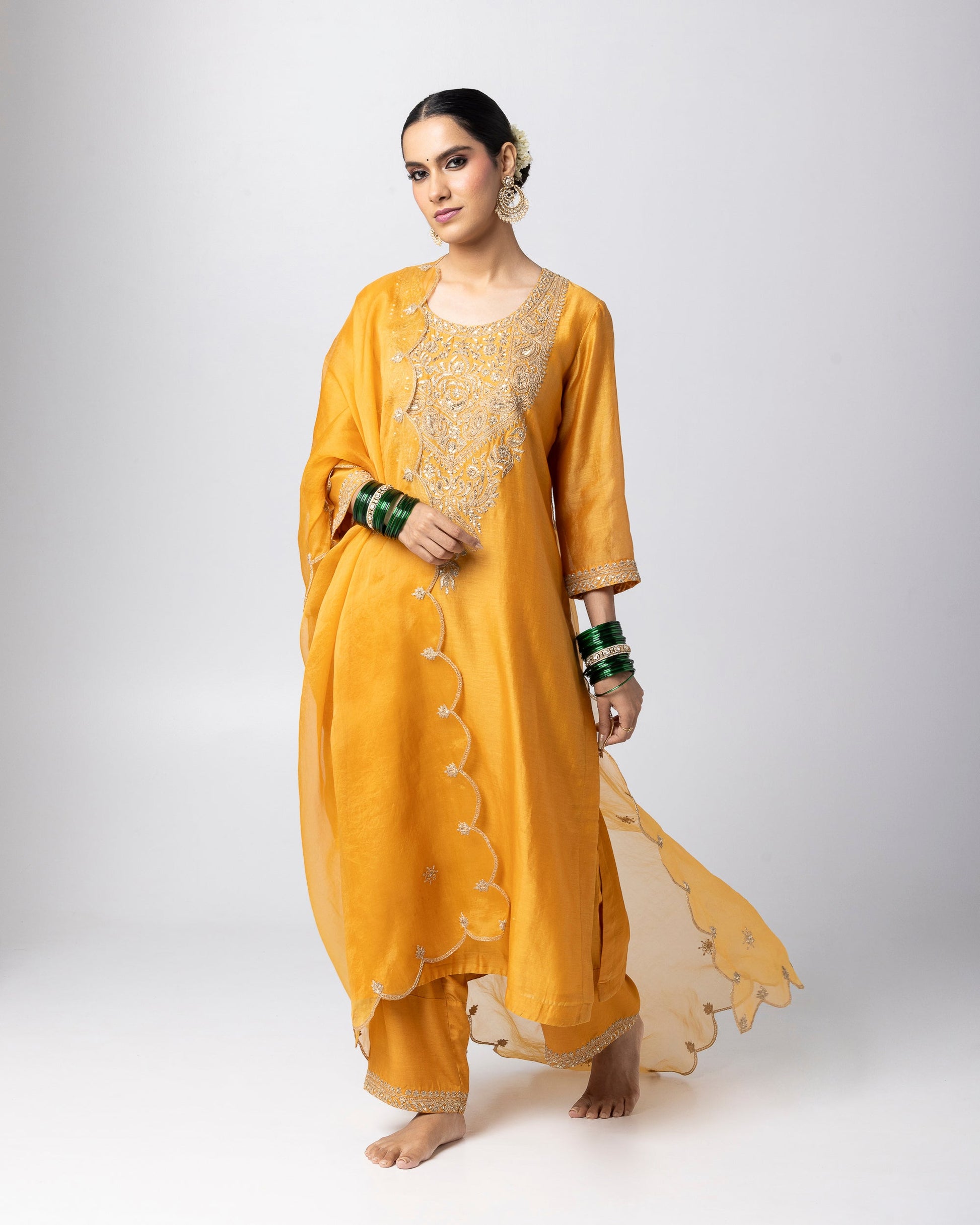 DESCRIPTION: Mustard pure silk chanderi long kurta has round neck with hand zardozi and machine dori embroidery. Sleeves are loose fit with hand zardozi and machine embroidery at the hem. kurta comes with attached lining. Bottom is straight fit in cotton silk with hand zardozi and machine embroidery at the hem. Dupatta is in pure silk organza has hand zardozi and machine embroidered motif and scalloped border all around.
