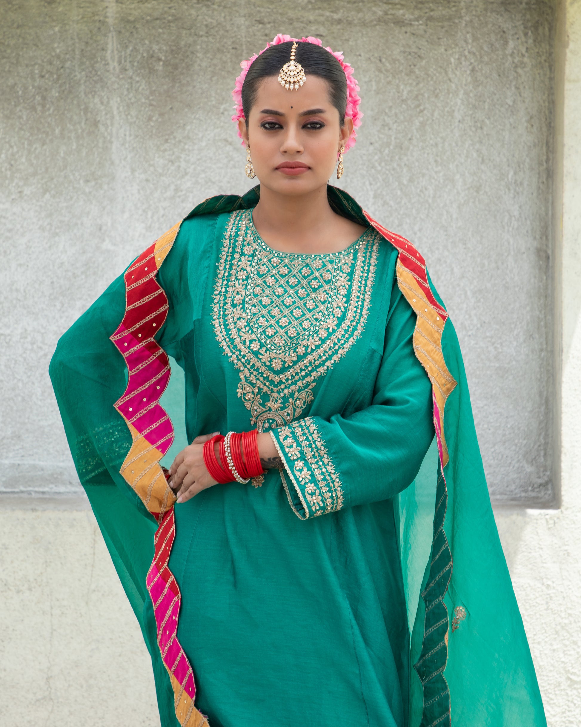 DESCRIPTION: Dupatta is in pure silk organza has hand zardozi and machine embroidered motif and scalloped border in multicolor all around.