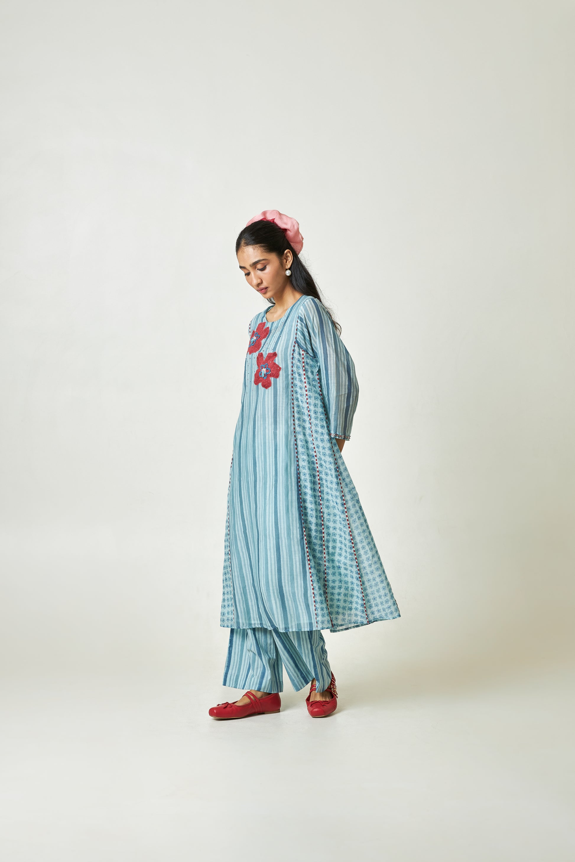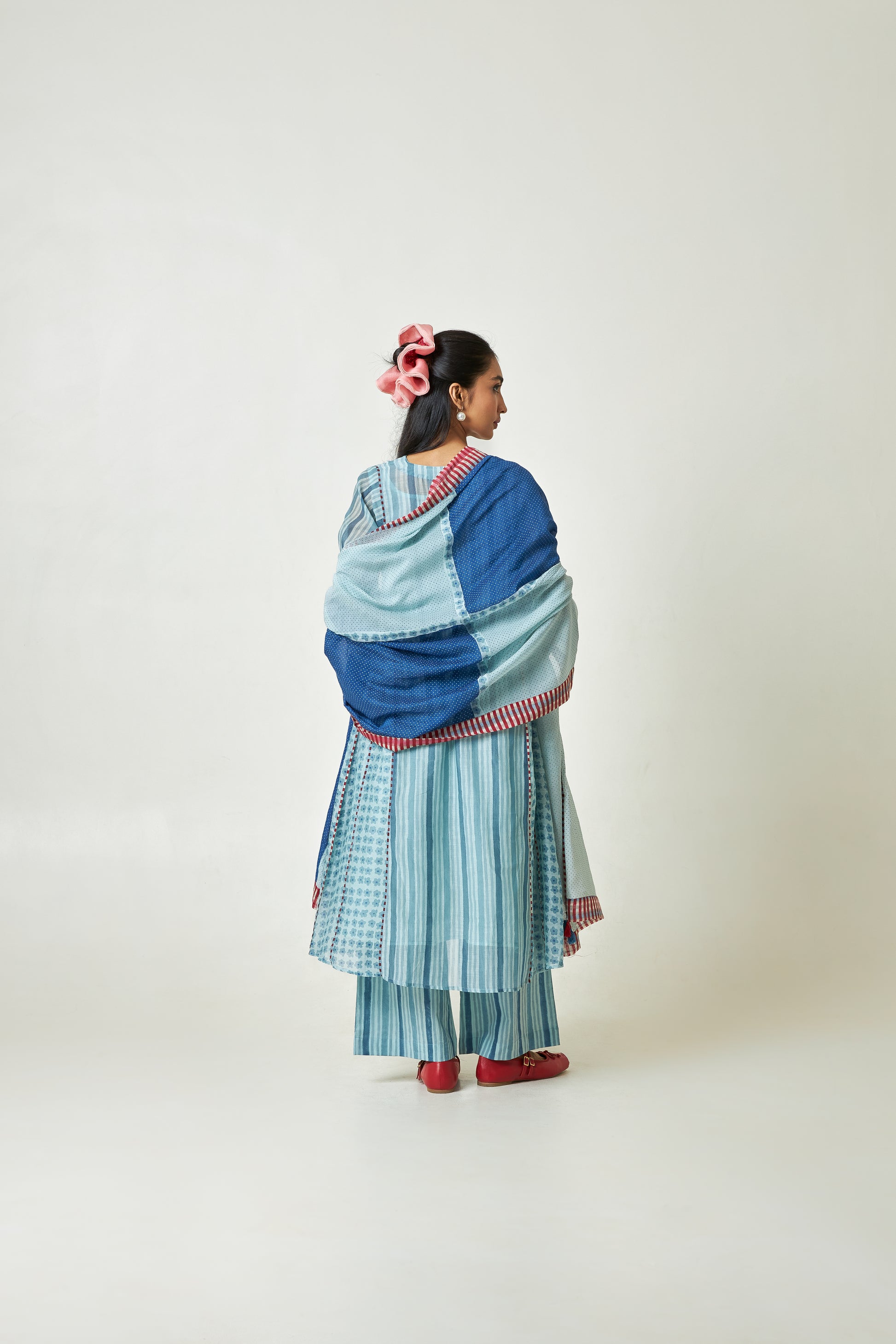 DESCRIPTION: Blue hand block printed chanderi mul long kurta has round neck with hand and machine embroidery in the front. sleeves has hand embroidery on the hem. kurta has separate lining. Bottom is straight fit in hand block printed cotton. Dupatta is in chanderi mul with hand block printed border all over, and tassels on the side.