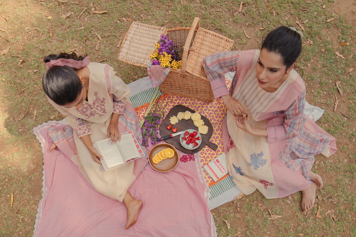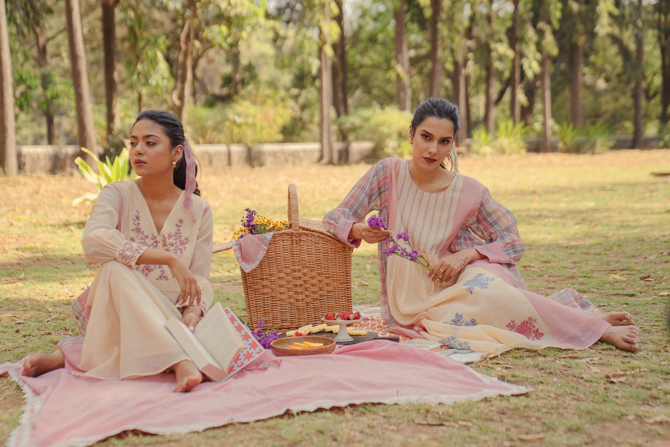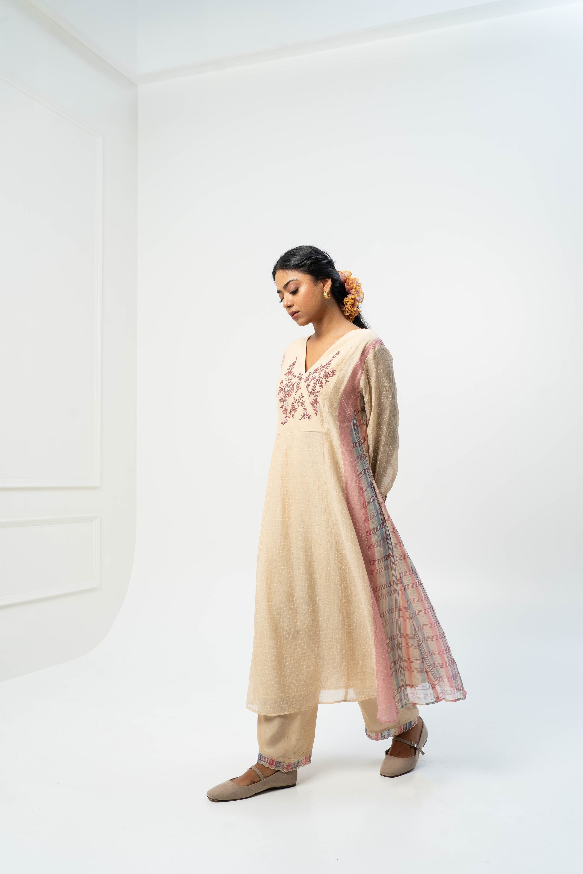 DESCRIPTION: Cream hand block printed chanderi mul long kurta has "V" neck with hand and machine embroidery on the yoke. sleeves has cuffs with hand and machine embroidery. kurta has attached lining. Kurta has pockets. Bottom is straight fit in cotton silk with machine embroidered scallop at the hem. Stole is in chanderi mul with hand and machine embroidered motifs, lace detail with hand block printed border all over, and tassels on the side.