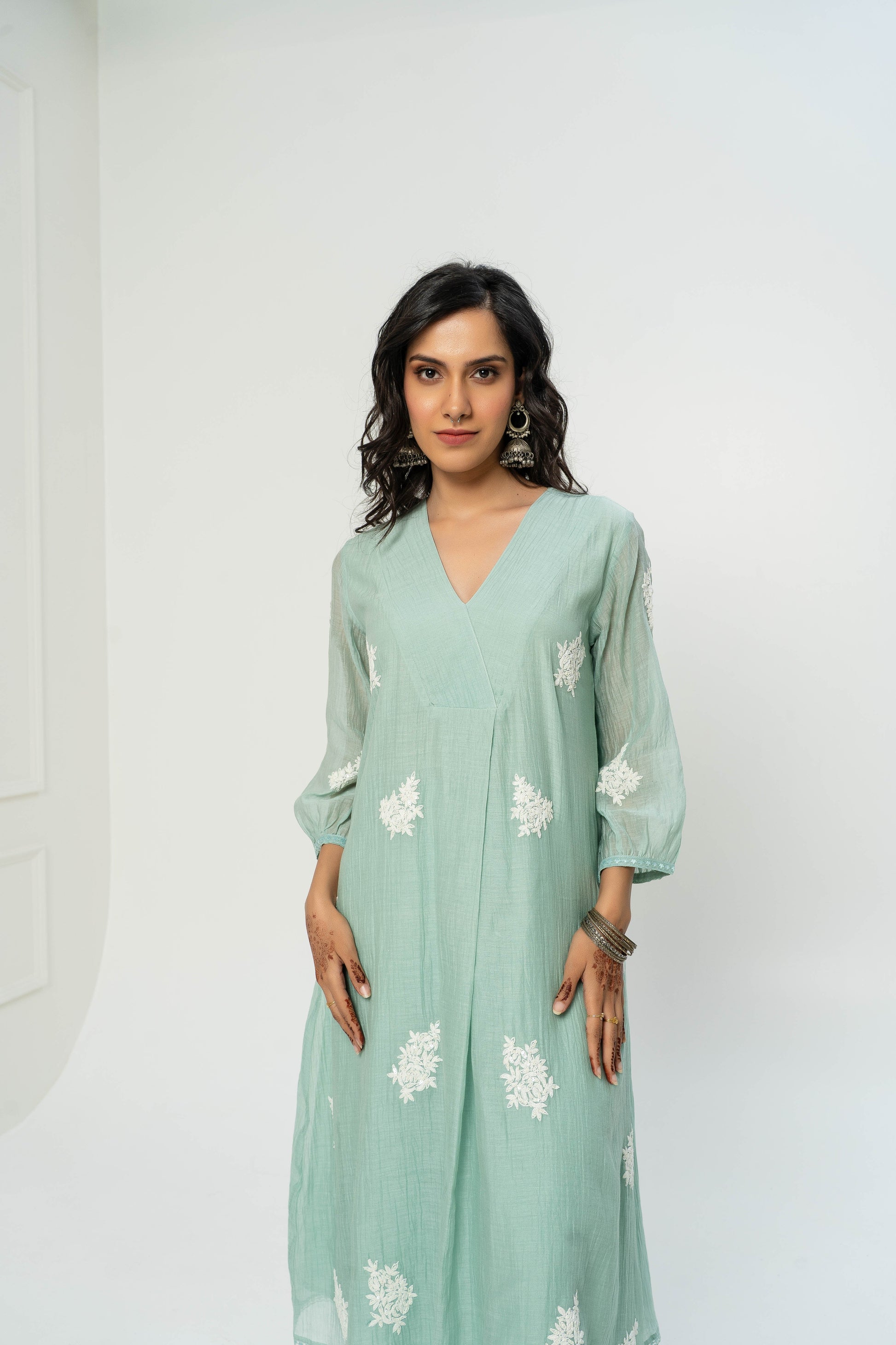 DESCRIPTION: Aqua chanderi mul long kurta has "V" neck with hand and machine embroidery all over and has lace detail on the hem. Sleeves have gathers with hand, machine embroidery and lace detail on the hem. Kurta has attached lining. Bottom is straight fit in cotton silk with machine embroidered scallop at the hem. Dupatta is in silk organza with polka dot print and scallope cut in the border.