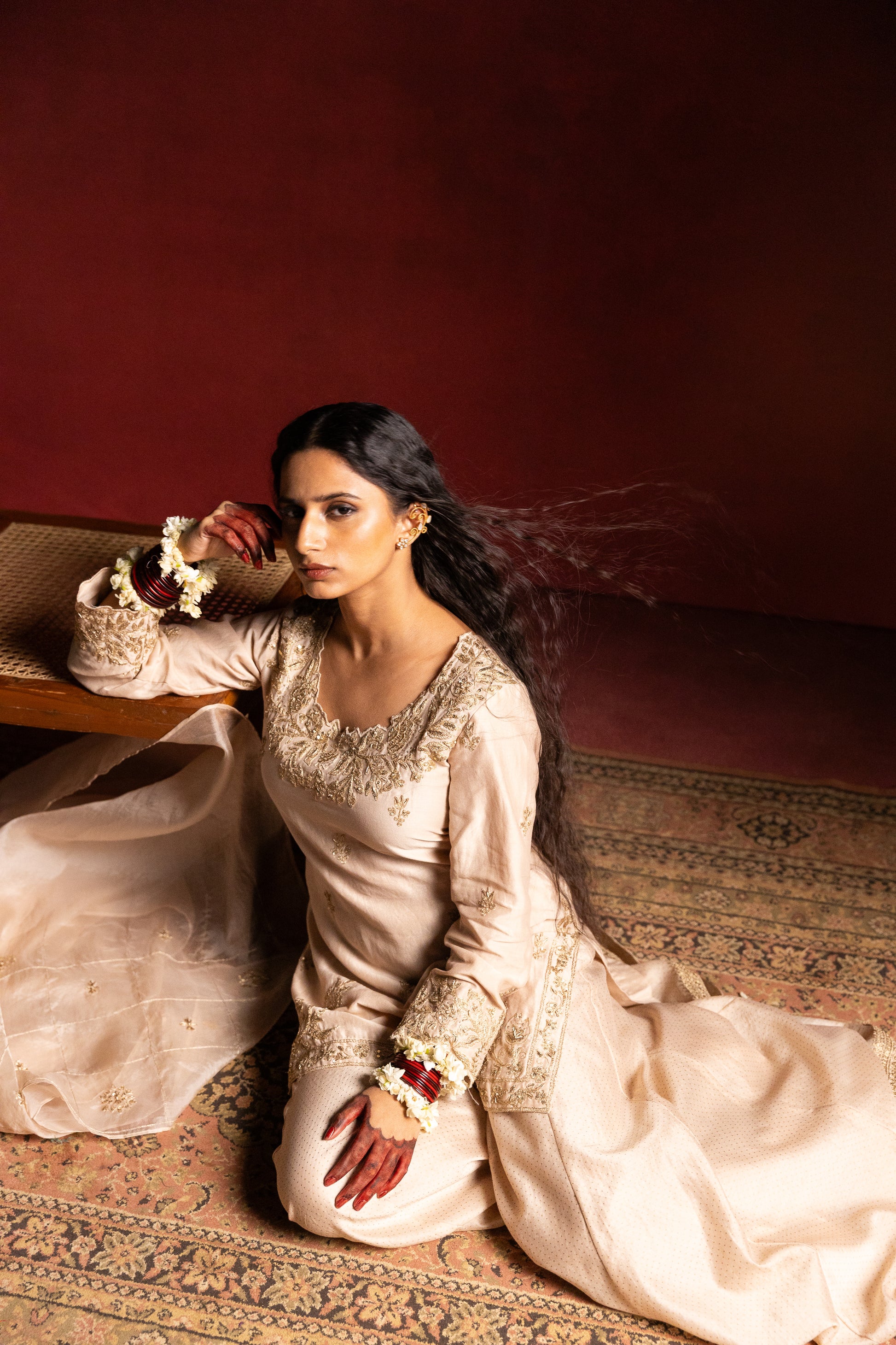 DESCRIPTION: Ivory silk chanderi short kurta has round neck with hand zardozi and machine dori embroidery. Sleeves are straight with hand zardozi and machine dori embroidery. Kurta comes with attached lining. Bottom is sharara in silk chanderi with lace detail on the hem. Dupatta is in silk organza with hand and machine embroidery.