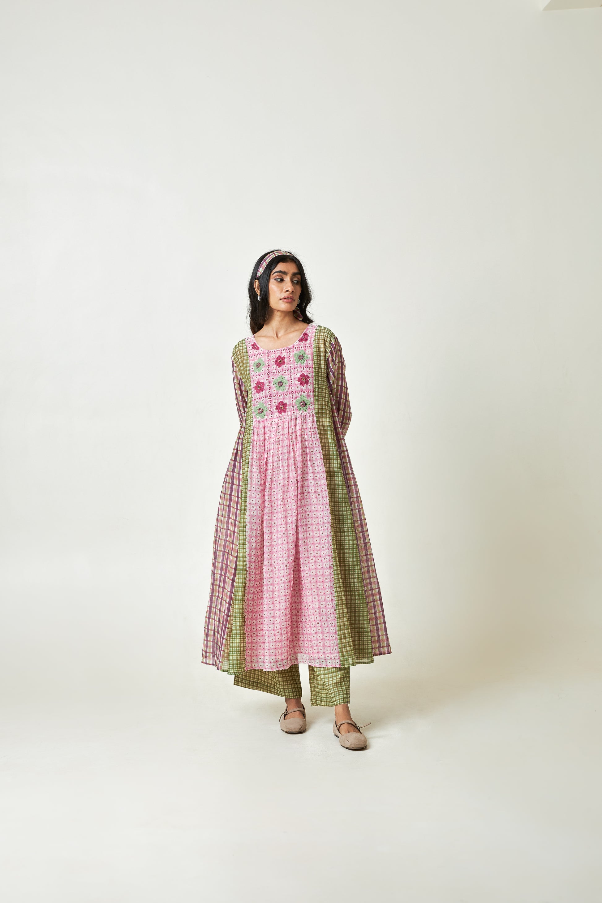DESCRIPTION: Multi hand block printed chanderi mul long kurta has round neck with hand and machine embroidery in the front. sleeves has hand embroidery on the cuff. kurta has attached lining.