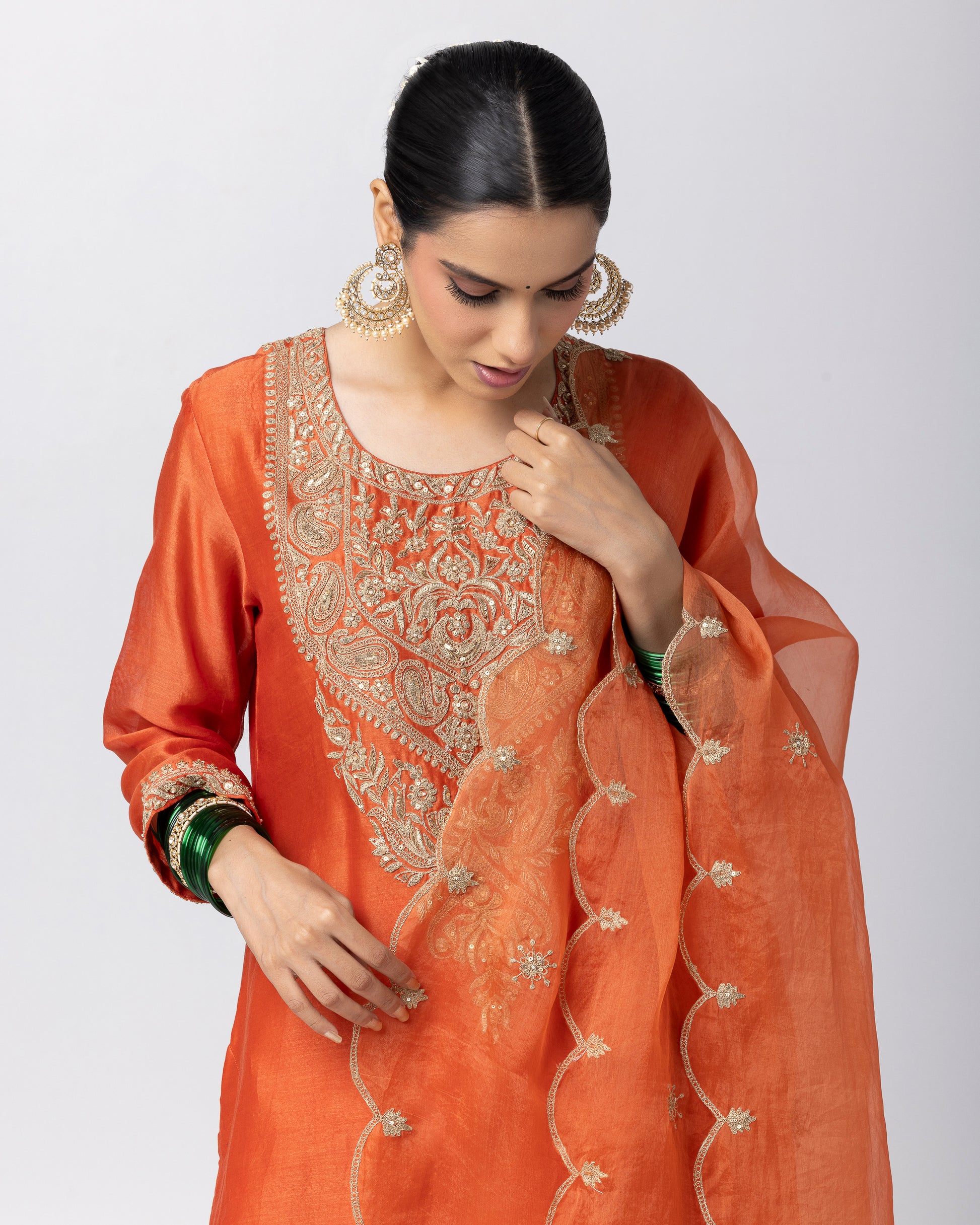 DESCRIPTION: Dupatta is in pure silk organza has hand zardozi and machine embroidered motif and scalloped border all around.