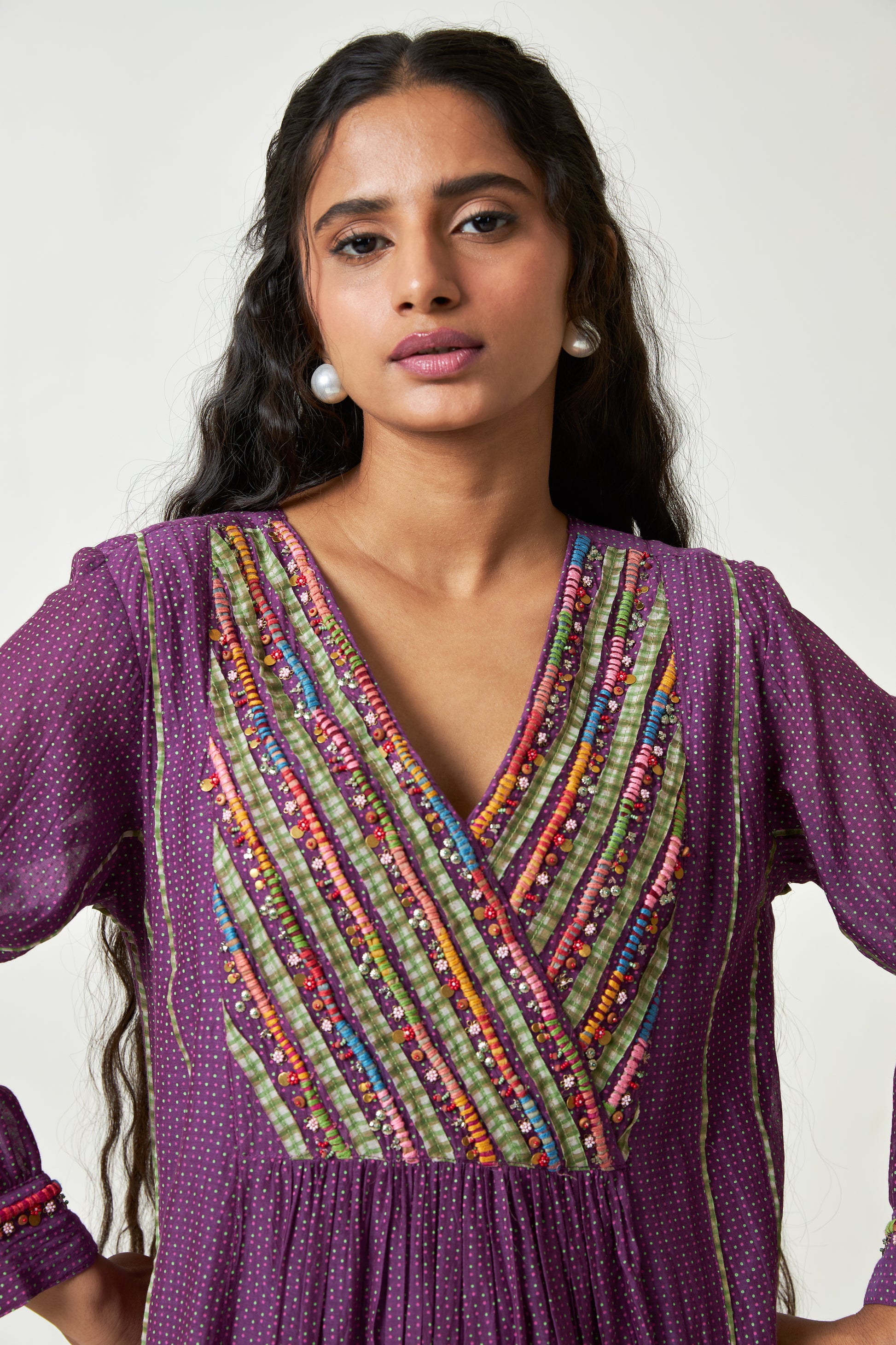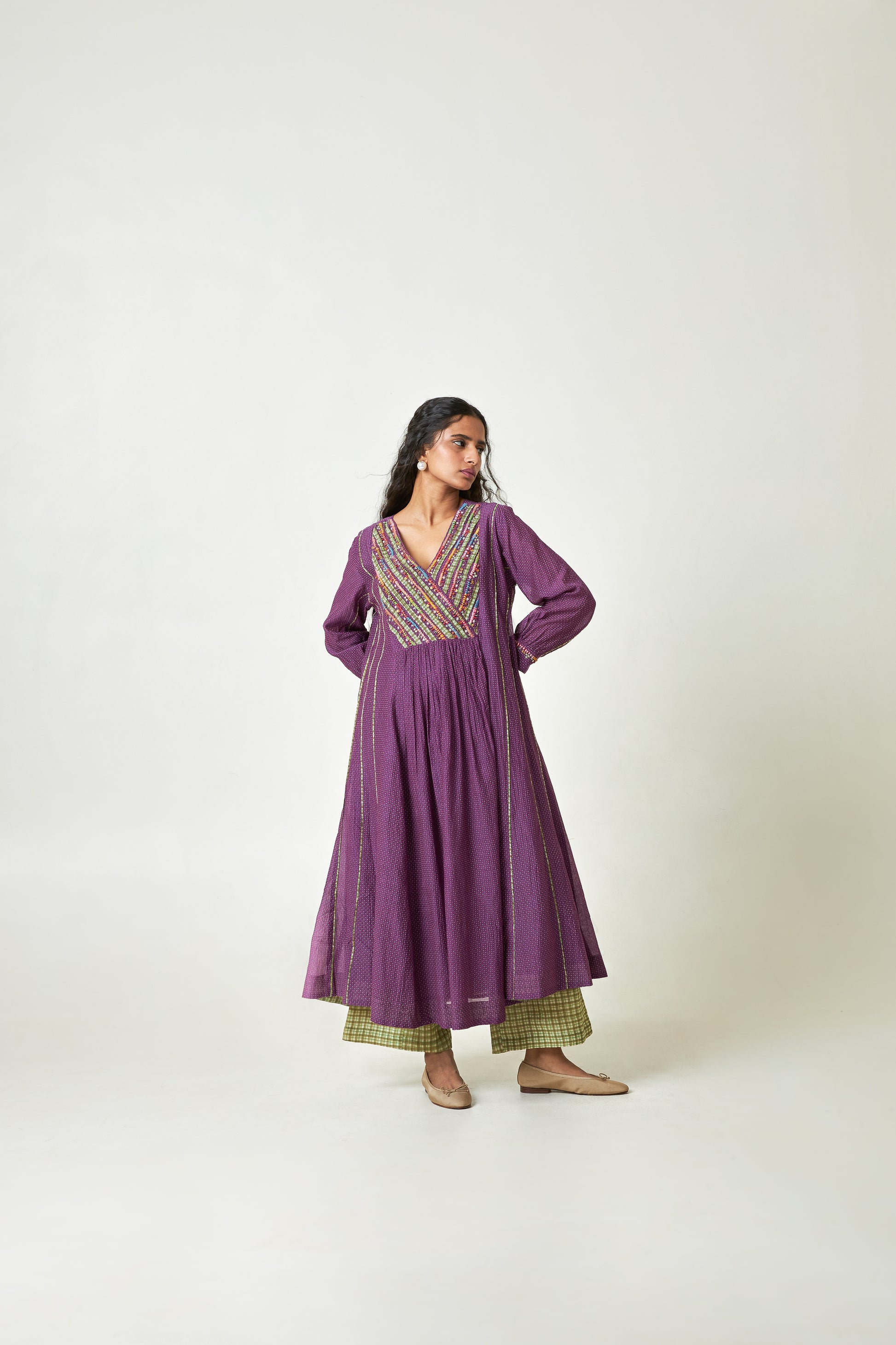 DESCRIPTION: Purple polka dot printed chanderi mul long kurta has 'V' neck with hand and machine embroidery in the front. sleeves has hand embroidery on the cuff. kurta has attached lining. Bottom is straight fit in hand block printed Chanderi Mul. Dupatta is in chanderi mul with printed border all over, and tassels on the side.