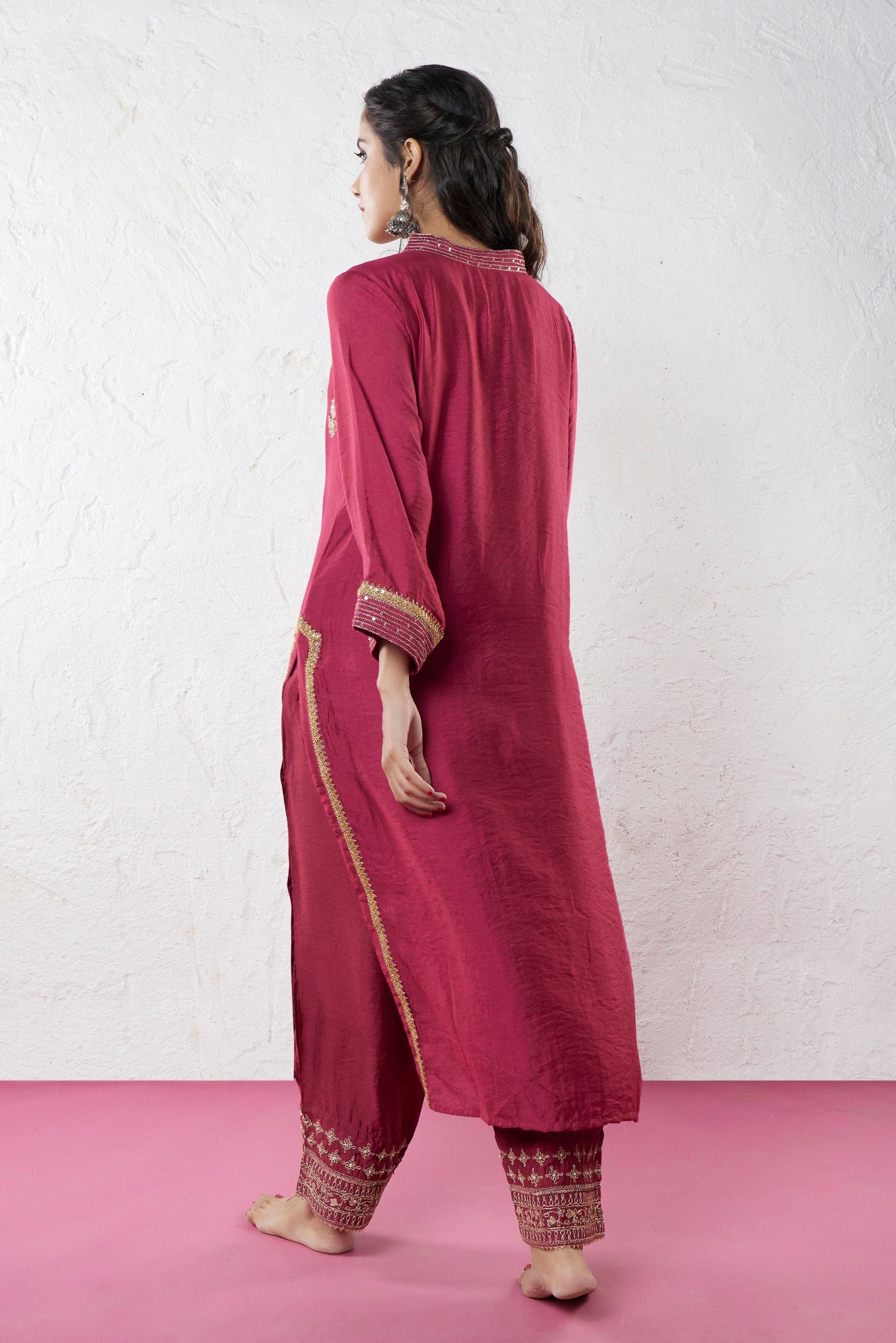 DESCRIPTION: Dark berry solid chanderi long kurta has ""V"" neck with hand and machine embroidery. Sleeves has hand and machine embroidery. Kurta has attached lining. Bottom is straight fit in chanderi with hand and machine embroidery at the hem. Dupatta is in gold polka dot printed viscose organza has gota phool with hand embroidery and lace all around the border.