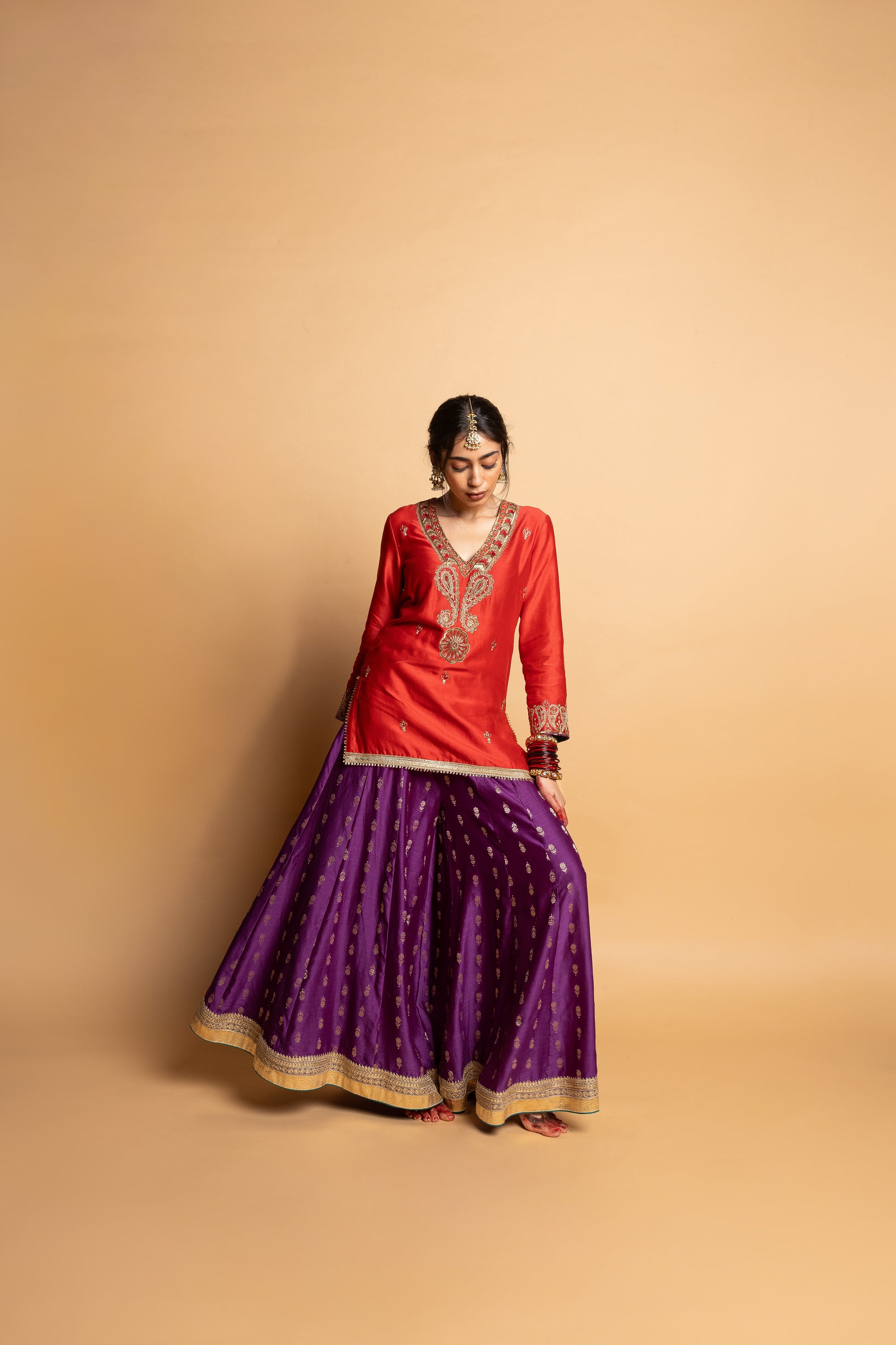 DESCRIPTION: Red silk chanderi short kurta has "V" neck with hand zardosi and machine embroidery. Sleeves are straight with hand and machine embroidery. Kurta comes with attached lining. Bottom is sharara in silk chanderi with lace detail on the hem. Dupatta is in silk organza has hand and machine embroidery with gold lace border all over.