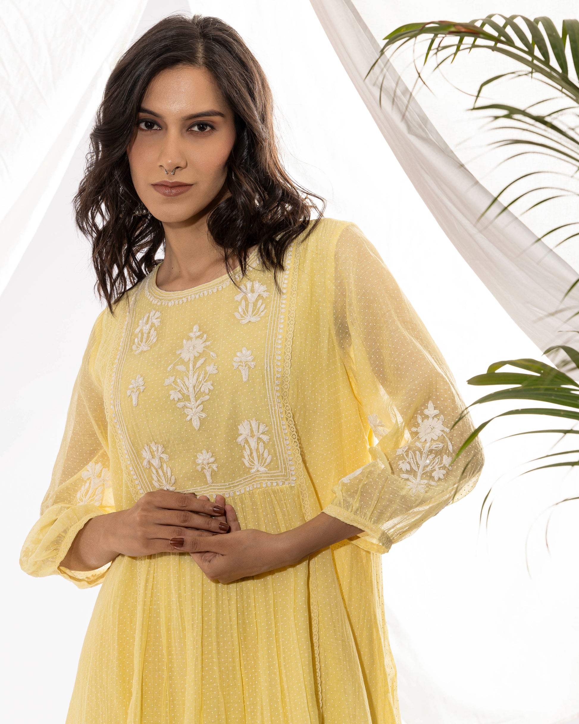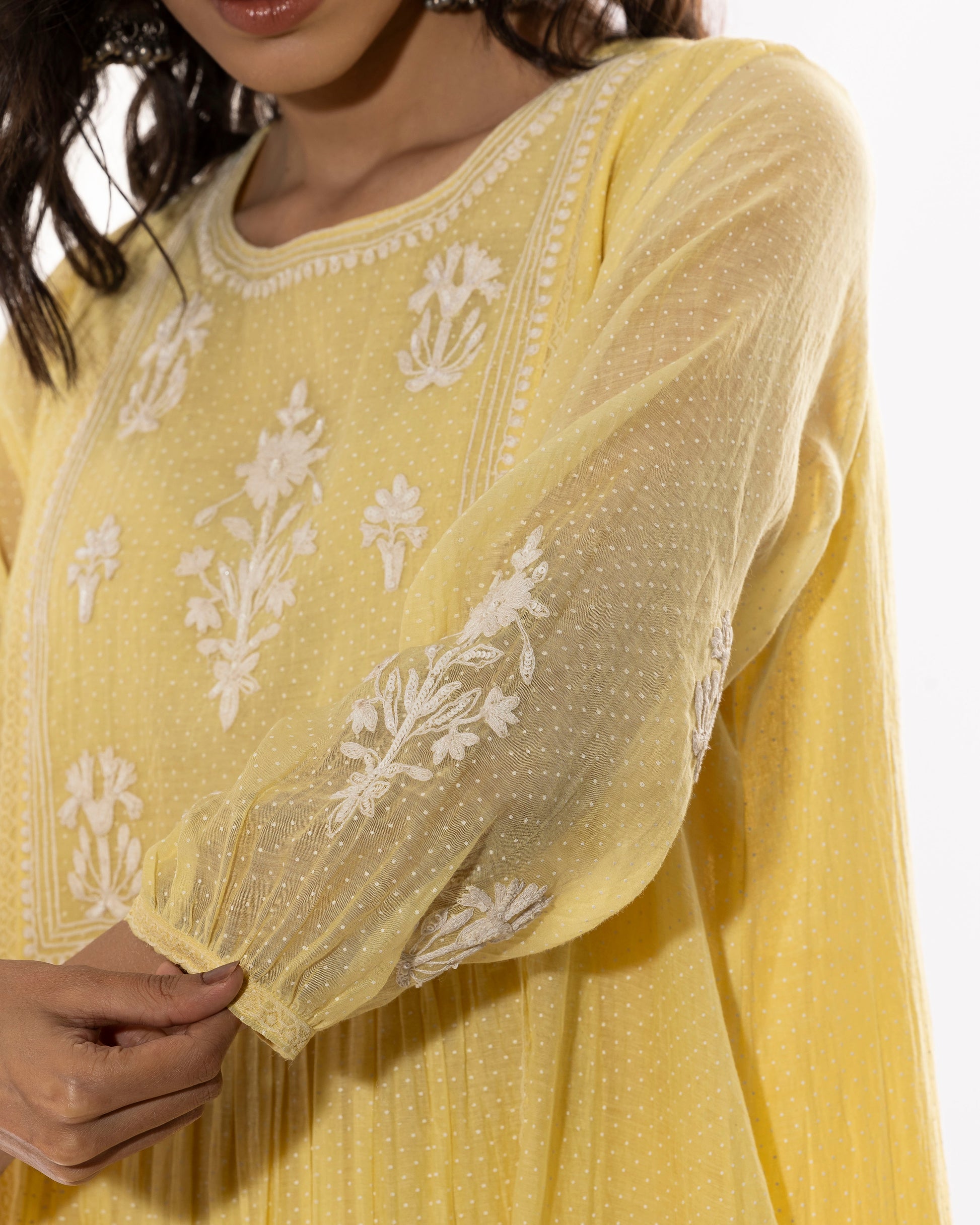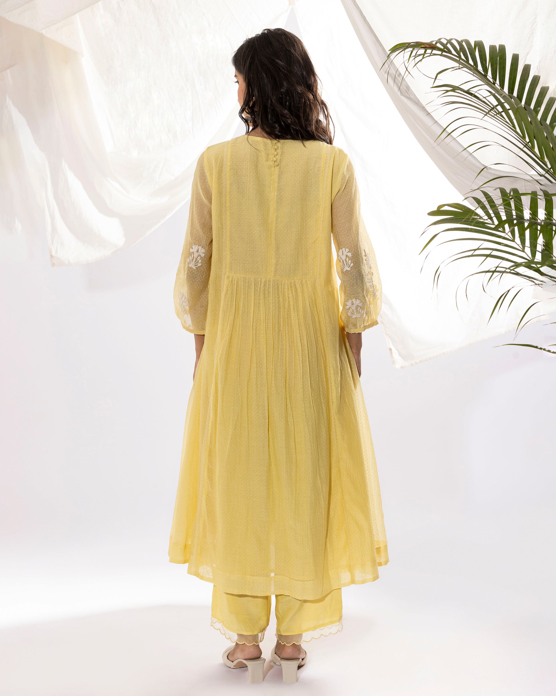 DESCRIPTION: Lemon yellow chanderi mul, white polka dot printed long kurta has round neck with hand and machine embroidery on the yoke and has lace detail on the front and back. Sleeves have gathers with hand, machine embroidery and lace detail on the hem. Kurta has attached lining.
