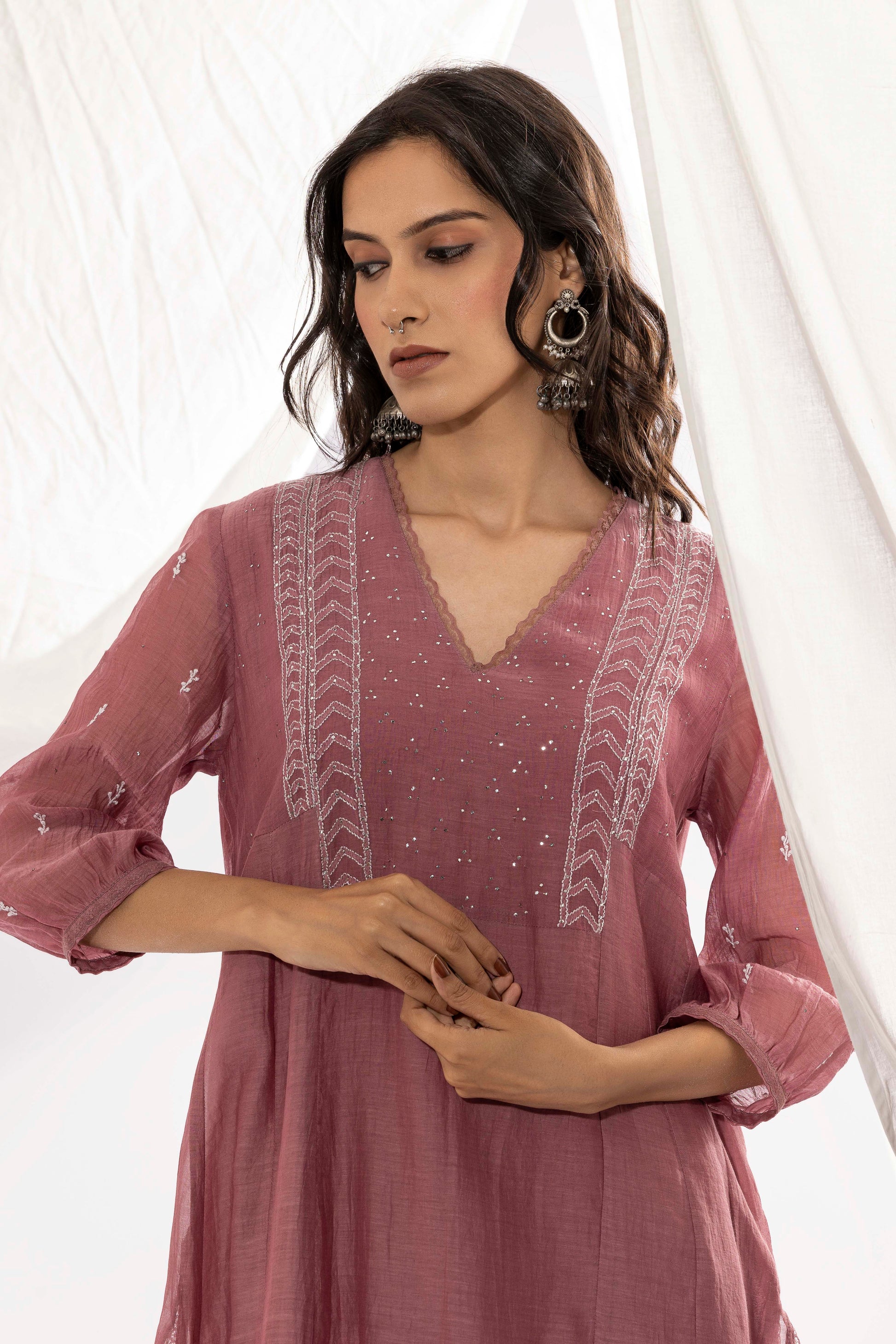 DESCRIPTION: Lilac chanderi mul long kurta has "V" neck with hand chikankari embroidery and mukaish work on the yoke and has lace detail on the neckline, side slit and the hem. Sleeves have gathers with hand chikankari embroidery, mukaish work and lace detail on the hem. Kurta has attached lining.