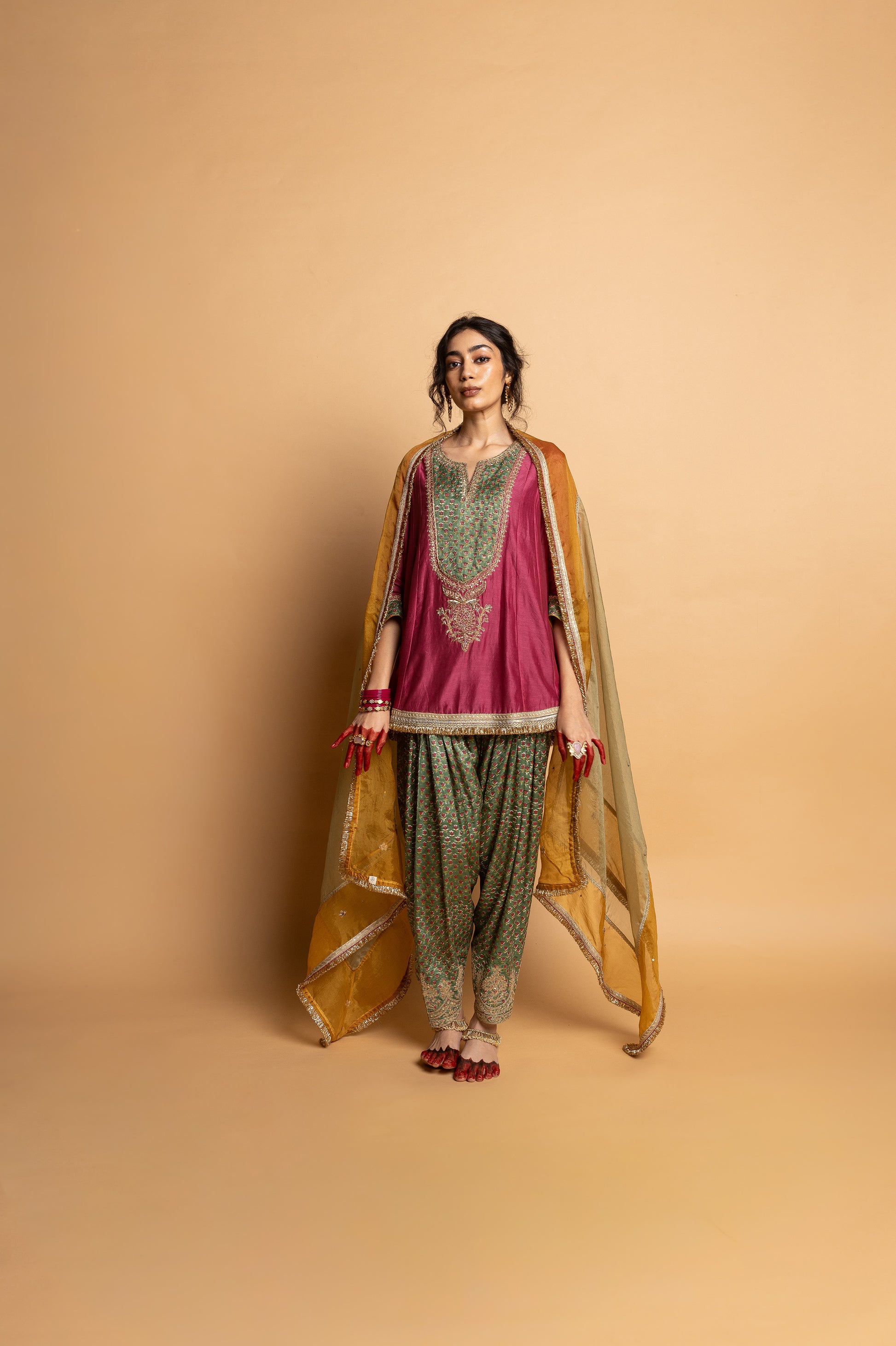 DESCRIPTION: Wine chanderi zari short kurta has round neck with hand zardozi and machine dori embroidery. Sleeves are straight with hand zardozi and machine dori embroidery. Kurta comes with attached lining. Bottom is salwar in silk with hand and machine dori embroiedery. Dupatta is in silk organza with hand embroidered motif and gold border all over.