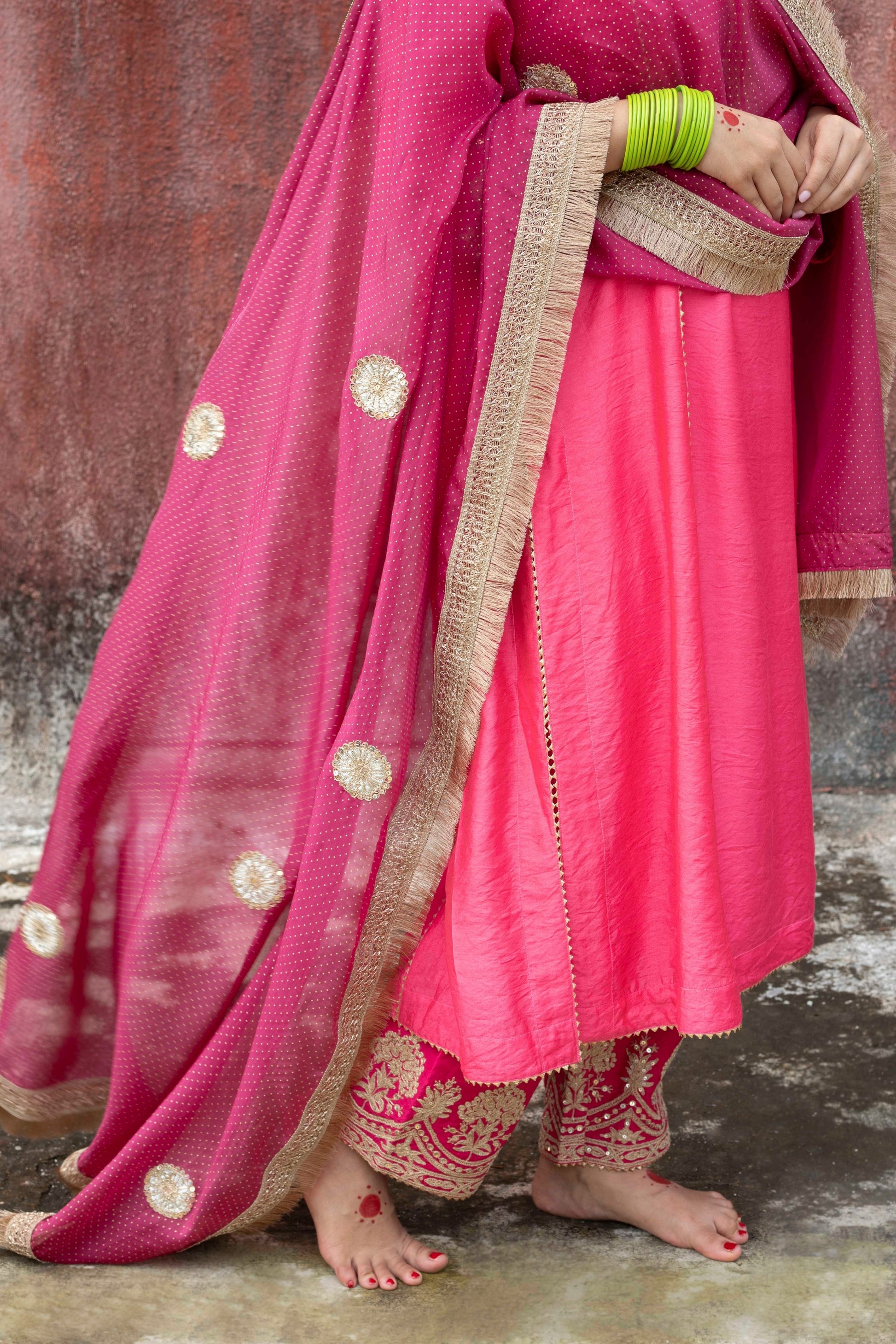 DESCRIPTION: Pink solid chanderi long kurta has round neck with hand and machine embroidery. Sleeves has hand and machine embroidery. Kurta has separate lining. Bottom is straight fit in chanderi with hand and machine embroidery at the hem. Dupatta is in gold polka dot printed viscose organza has gota phool with hand embroidery and lace all around the border.