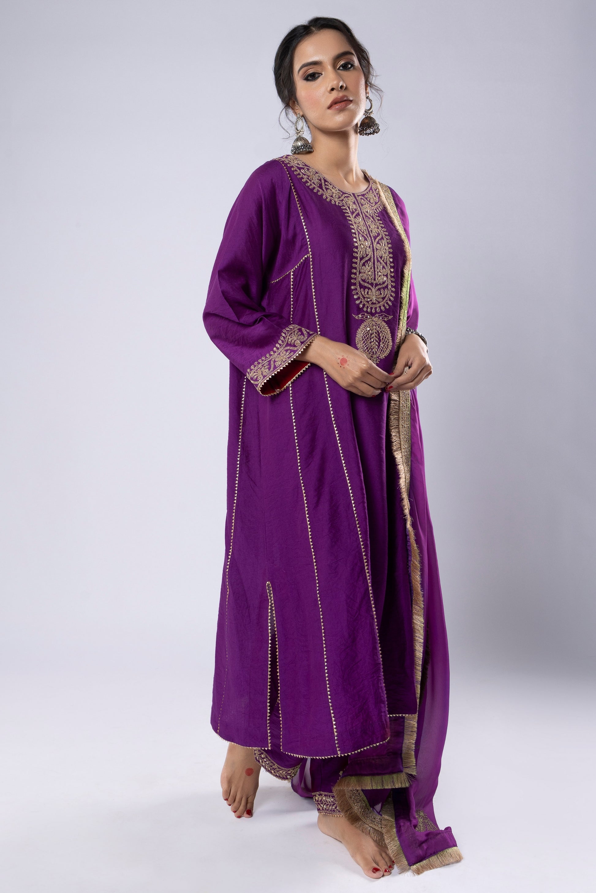DESCRIPTION: Purple solid chanderi long kurta has round neck with hand and machine embroidery. Sleeves has hand and machine embroidery. Kurta has separate lining.