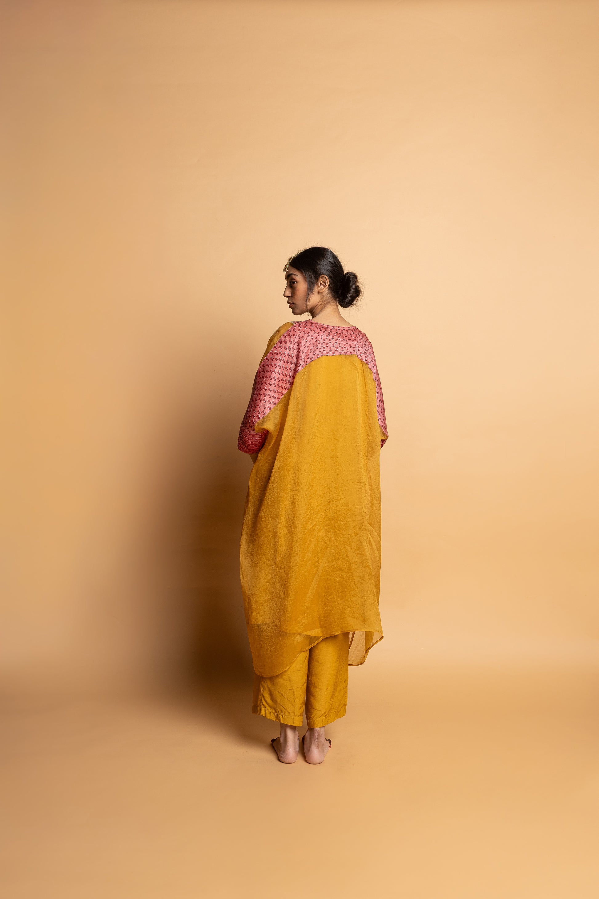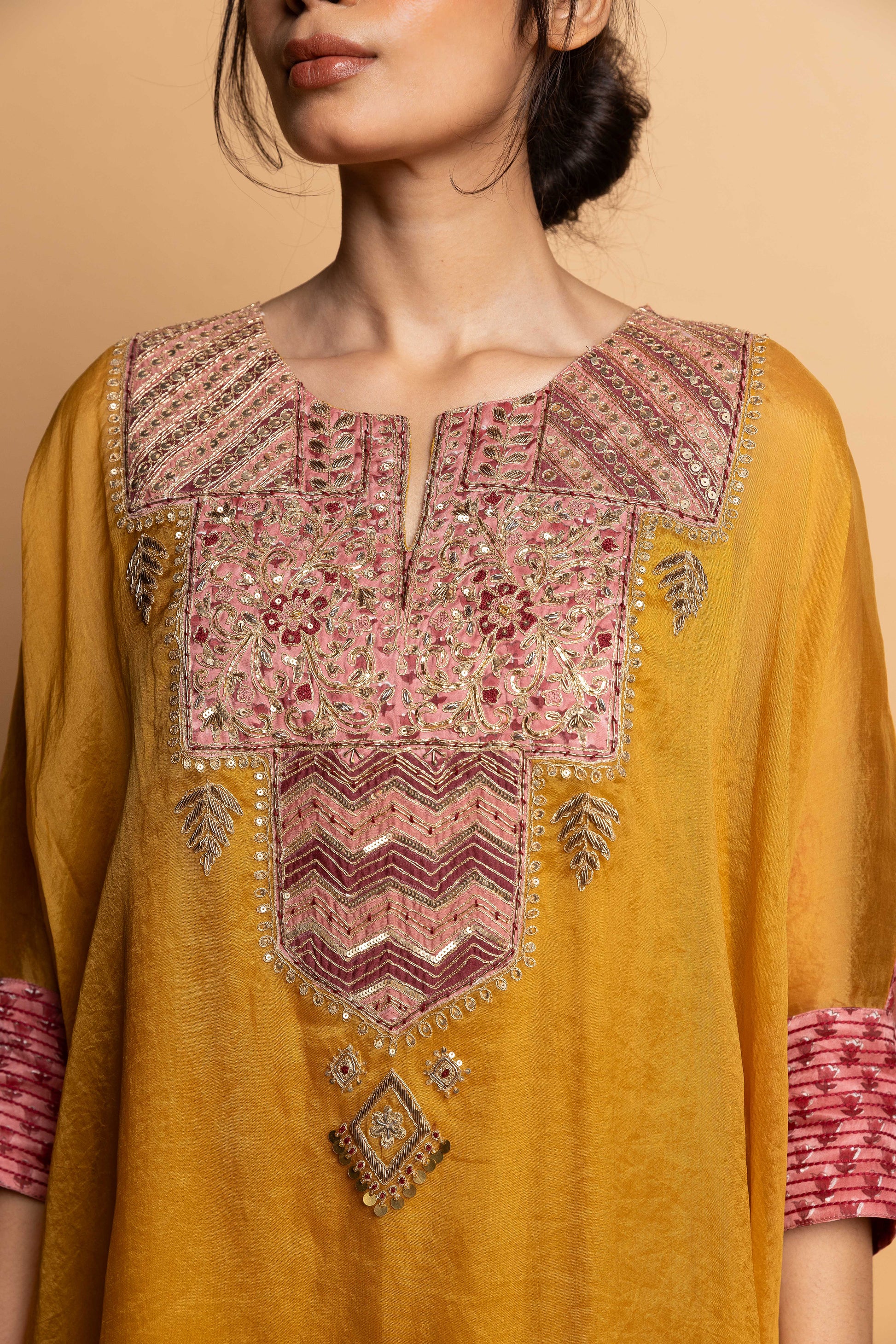 DESCRIPTION: Mustard silk organza kaftan has round neck with hand zardosi and machine embroidery on hand block printed fabric. Sleeves are loose fit with machine embroidery. Kaftan comes with separate lining. Botton is straight fit in cotton silk .