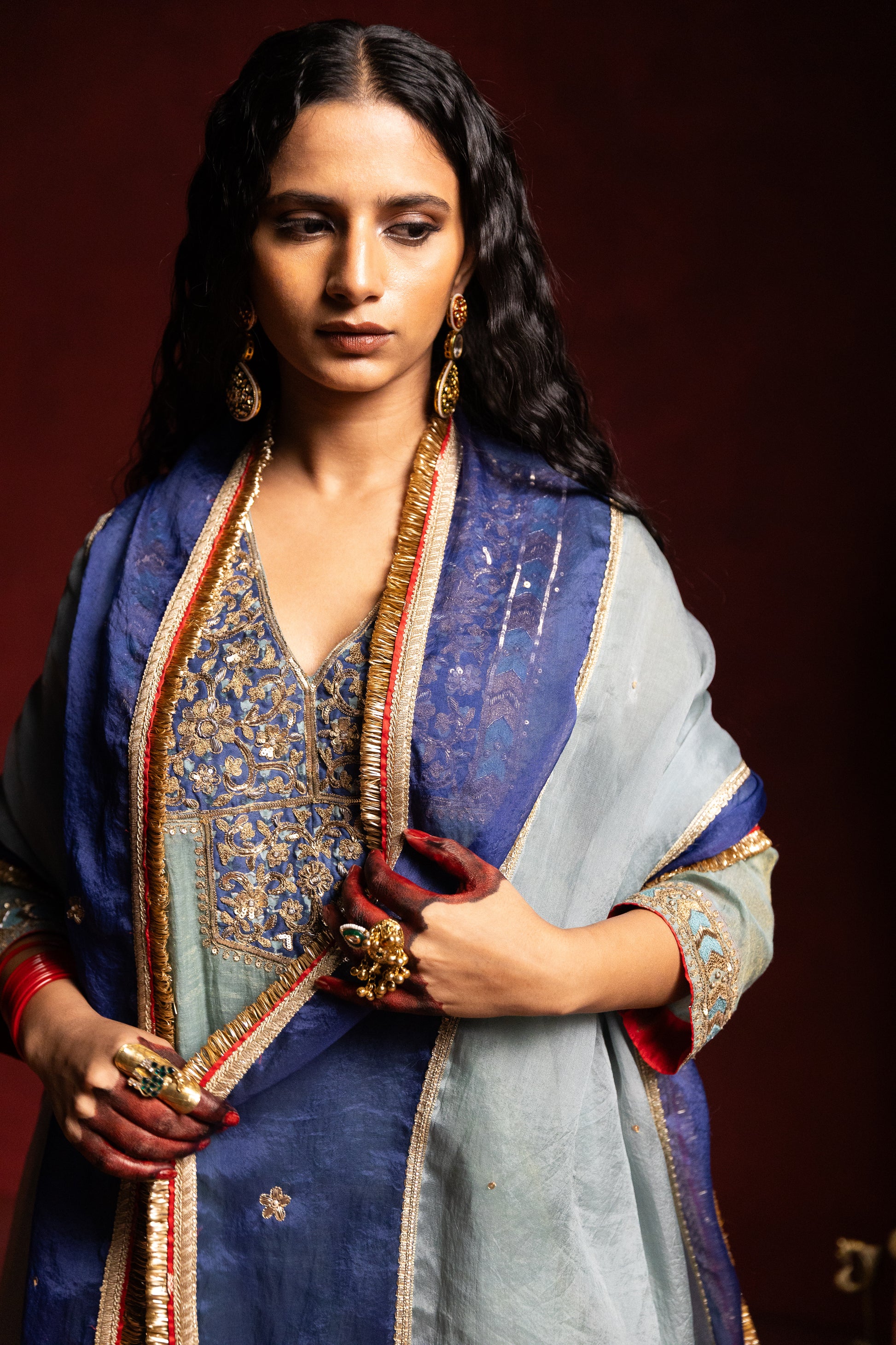 DESCRIPTION: Dupatta is in silk organza with hand embroidered motif and gold border all over.