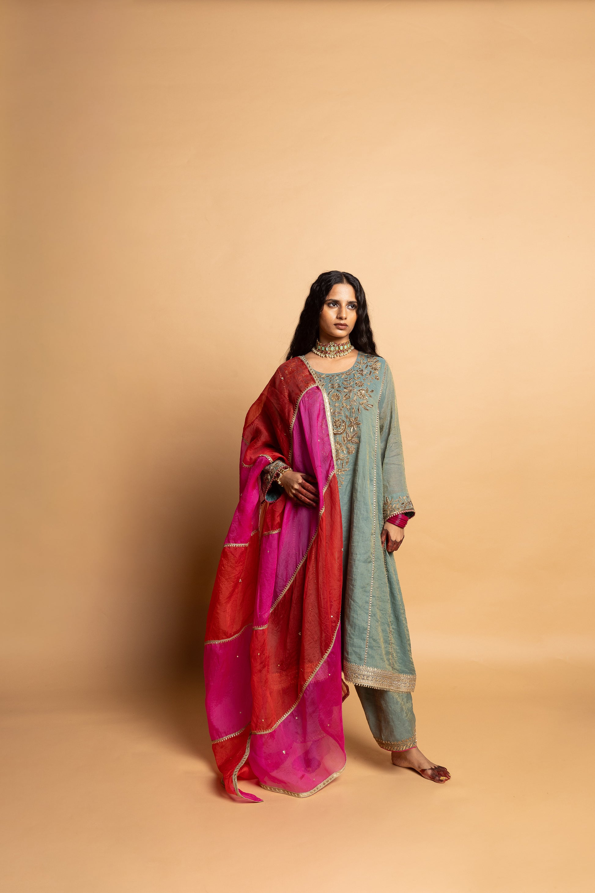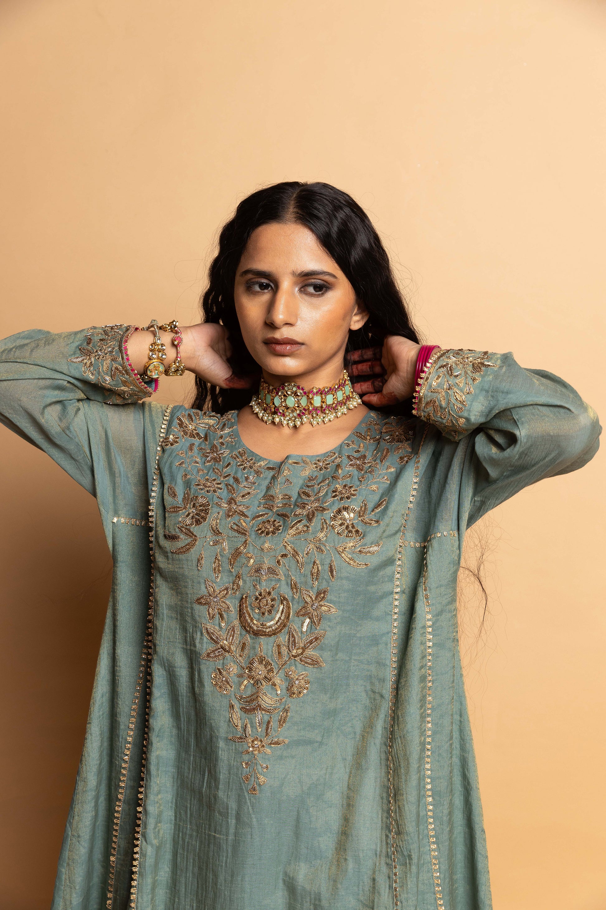 DESCRIPTION: Aqua chanderi zari kurta has round neck with hand zardozi and machine dori embroidery. Sleeves are straight with hand zardozi and machine dori embroidery. Kurta comes with attached lining. Bottom is salwar in chanderi zari with hand and machine dori embroiedery. Dupatta is in silk organza with hand embroidered motif and gold border all over.