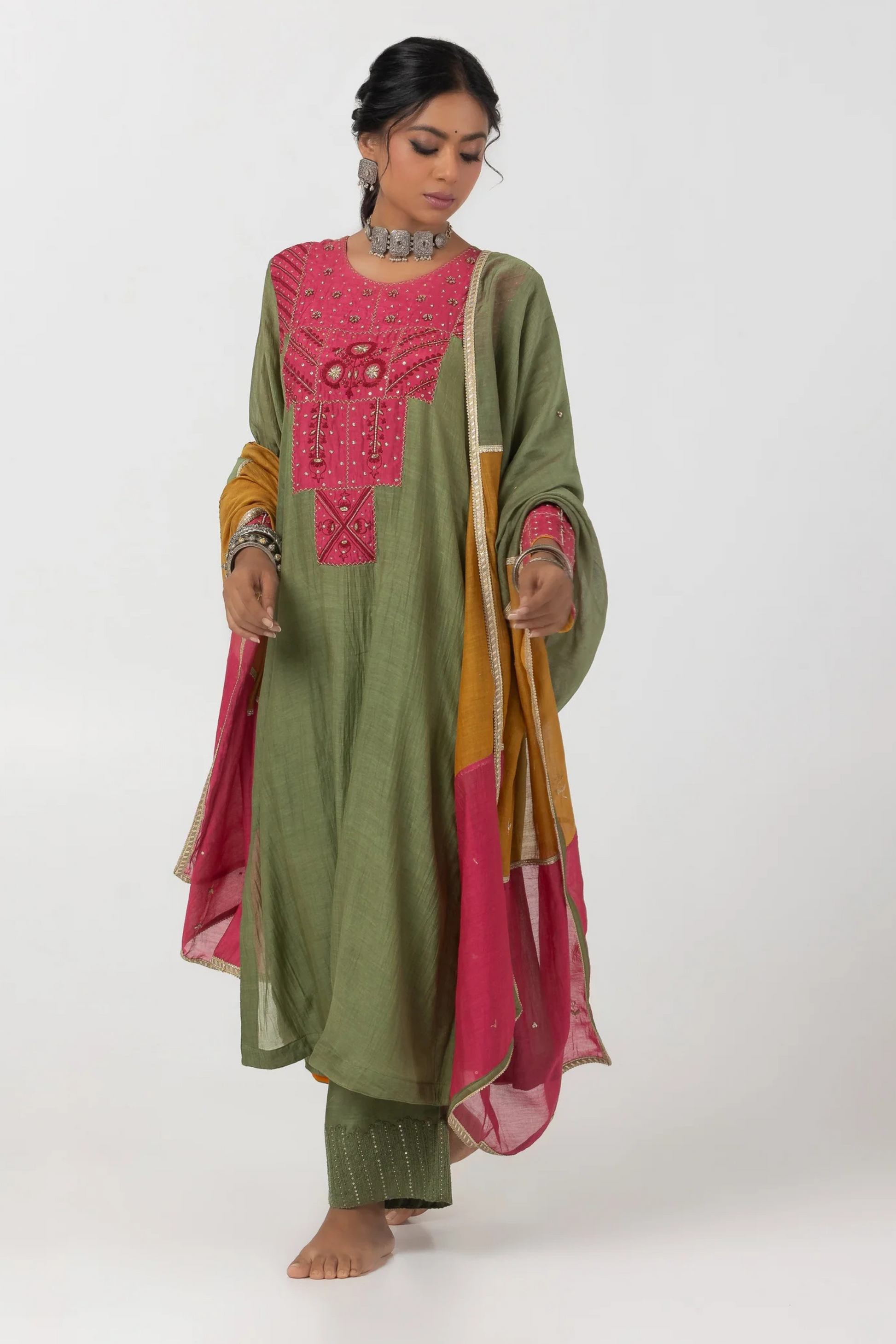 DESCRIPTION: Dupatta is in three color chanderi mul with hand embroidered motif, gold border all over.