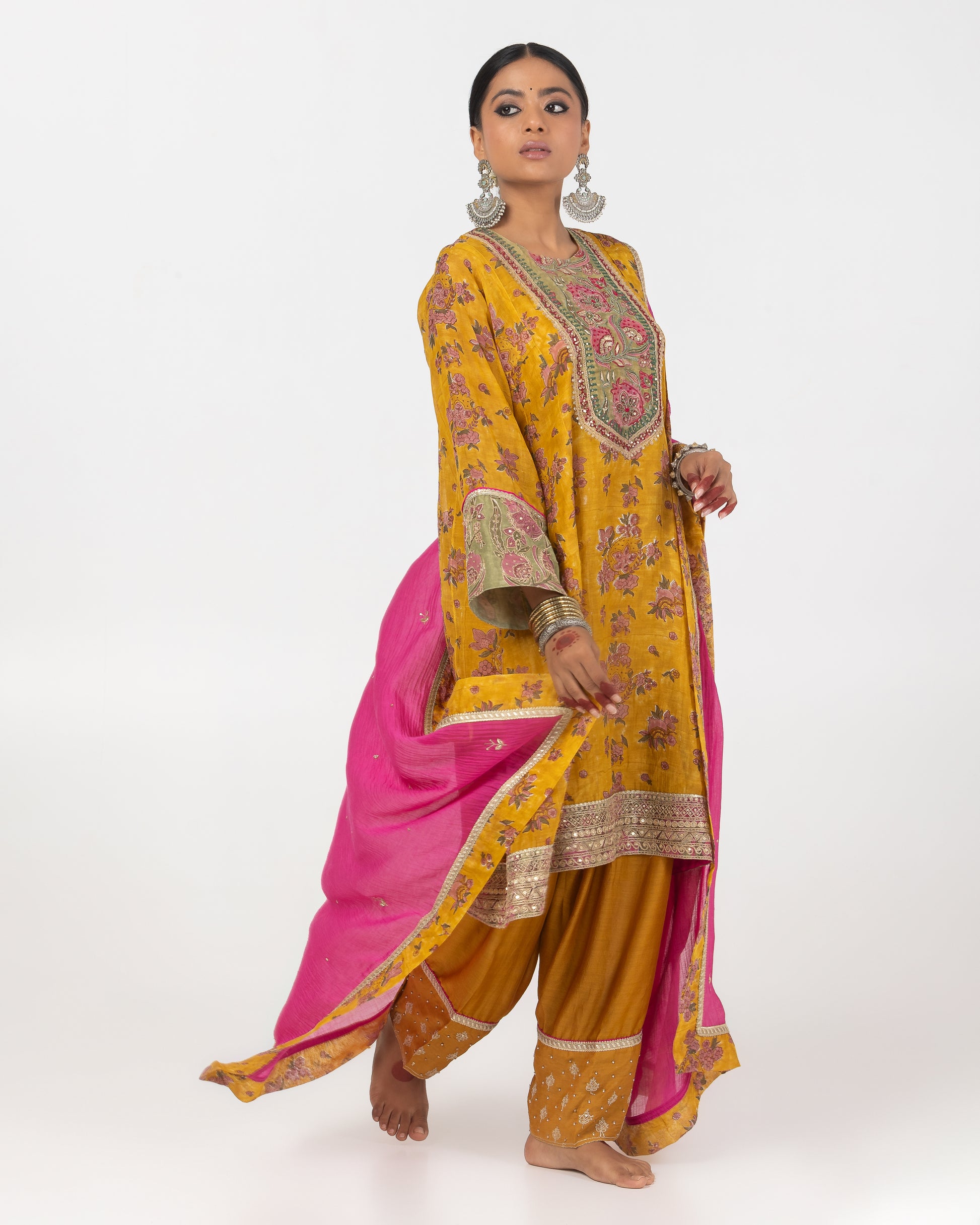 DESCRIPTION: Dupatta is in chanderi mul with hand embroidered motif, gold border and contrast print border all over.