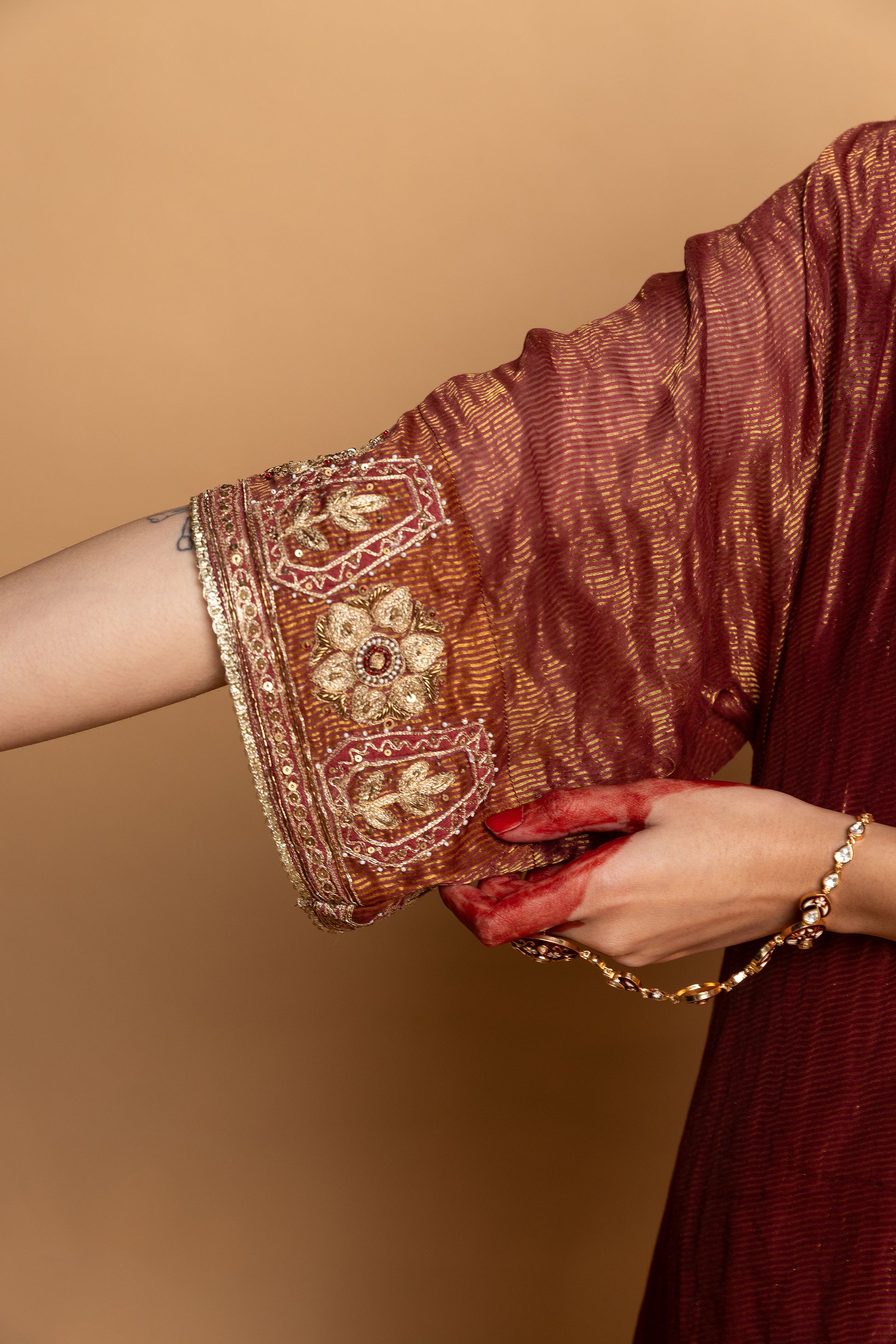 DESCRIPTION: Maroon chanderi zari kaftan has "V" neck with hand zardosi and machine embroidery. Sleeves are loose fit with hand zardosi and machine embroidery. Kaftan comes with attached lining. Botton is straight fit in cotton silk with hand hand machine embroidery.