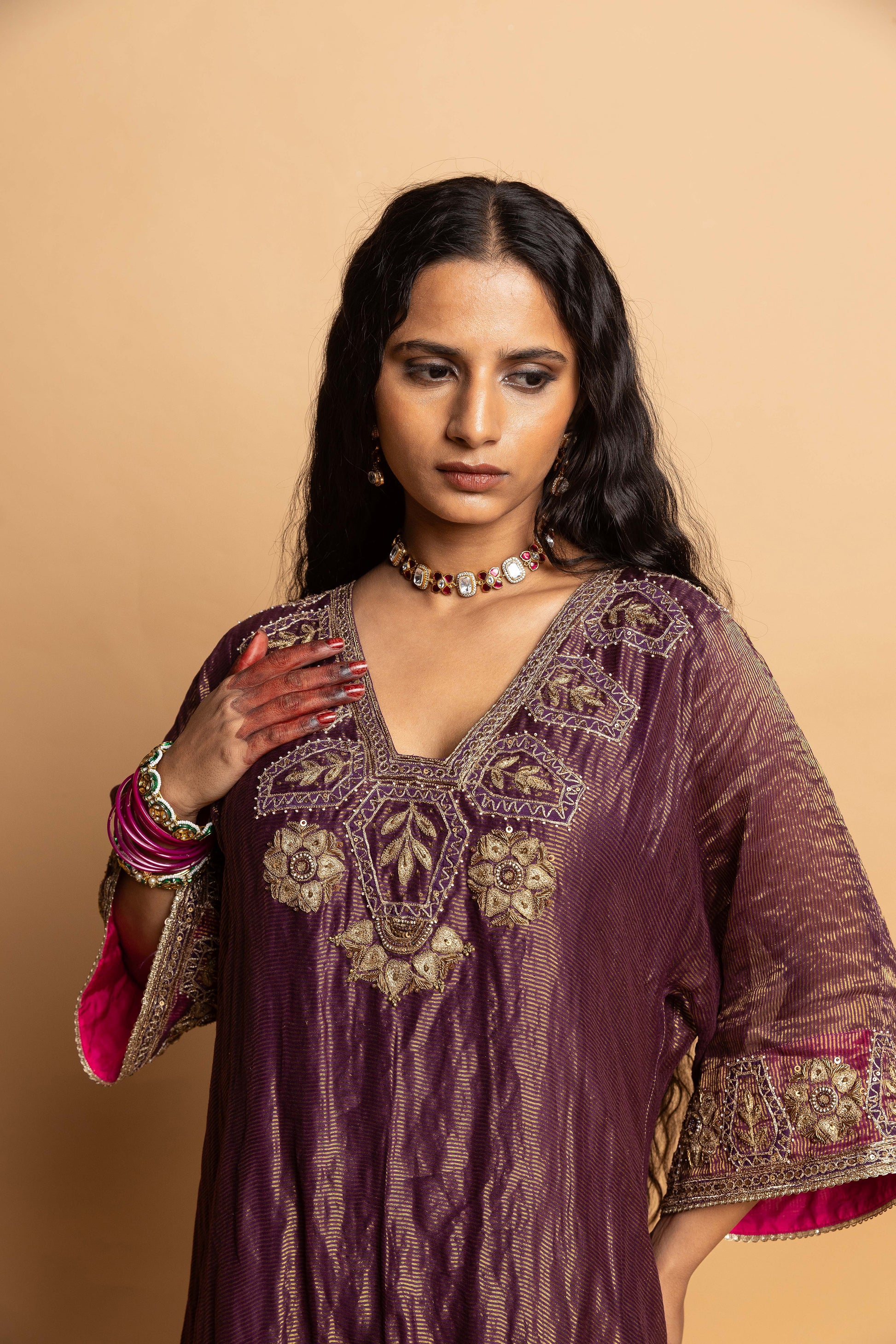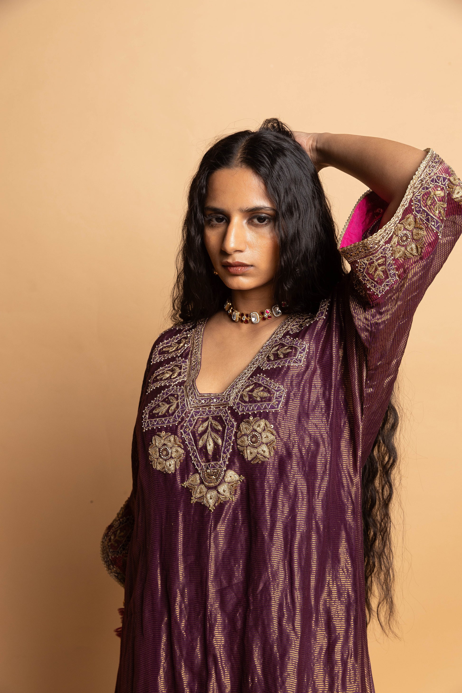 DESCRIPTION: Purple chanderi zari kaftan has "V" neck with hand zardosi and machine embroidery. Sleeves are loose fit with hand zardosi and machine embroidery. Kaftan comes with attached lining. Botton is straight fit in cotton silk with hand hand machine embroidery.