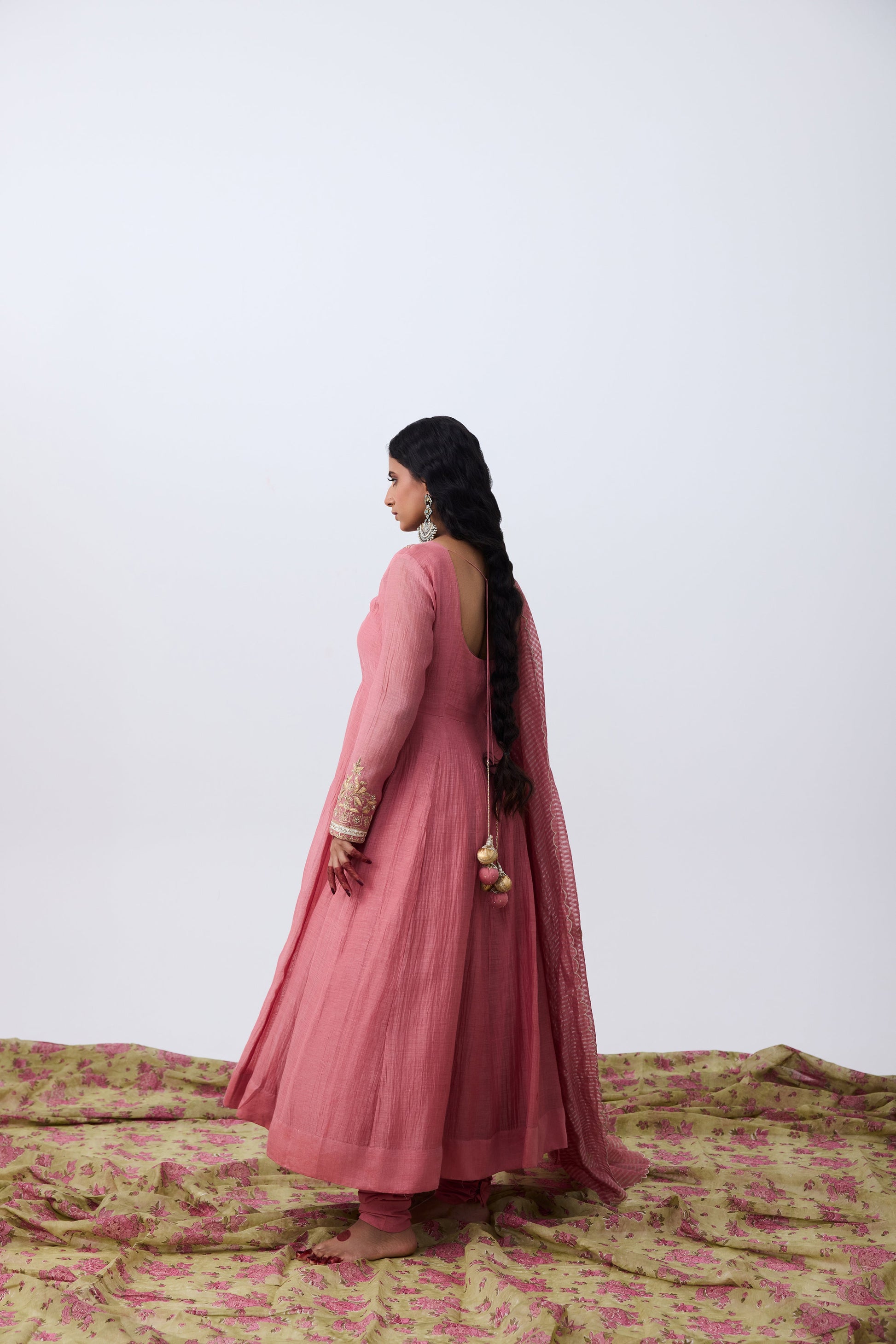 DESCRIPTION: Blush pink chanderi mul anarkali kurta has round neck with hand zardozi and machine dori embroidery. Sleeves are fitted with hand zardozi and machine embroidery. kurta comes with attached lining. Bottom is Churidar in cotton. Dupatta is in pure chanderi zari has hand zardozi and machine embroidery motifs with scallope border.