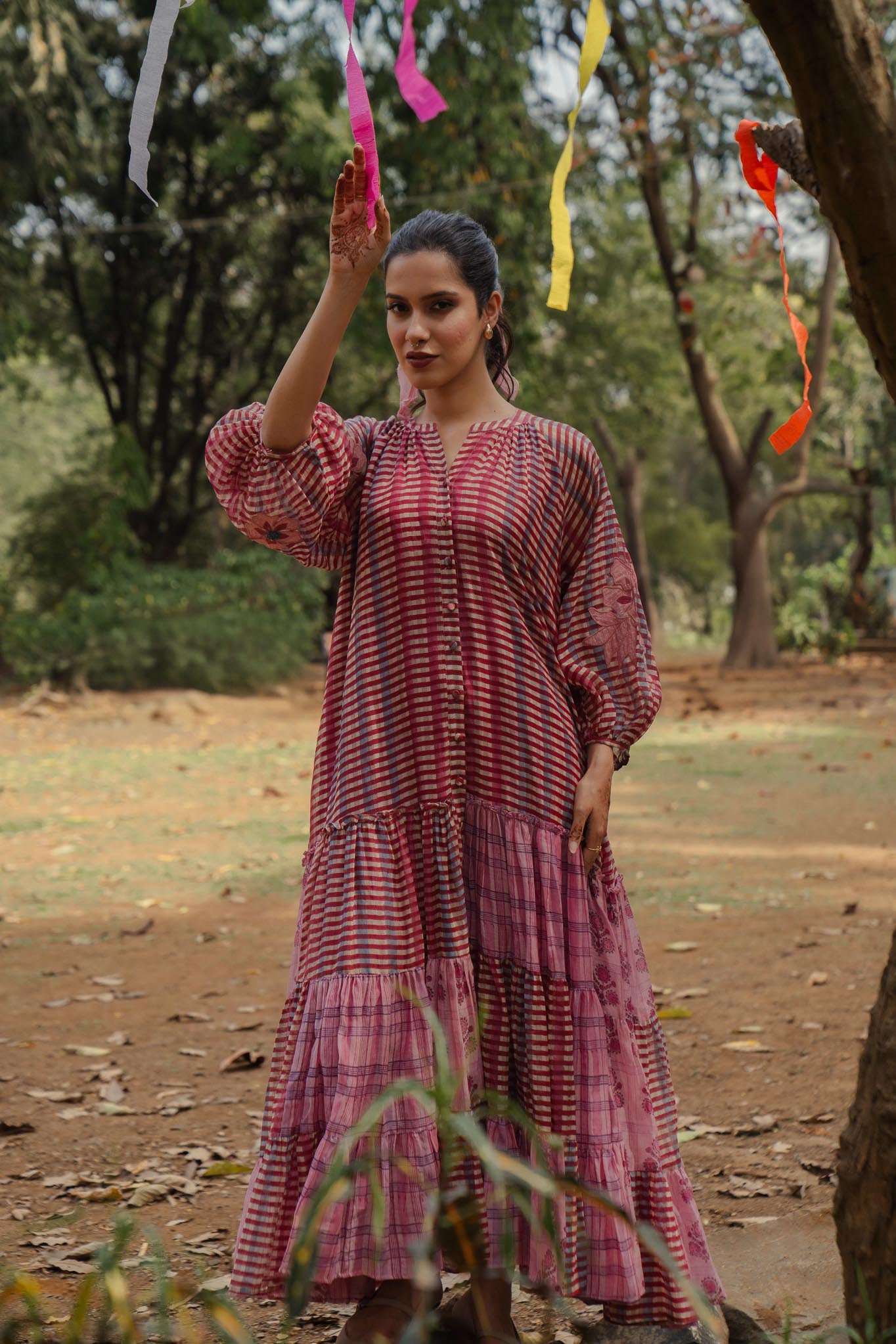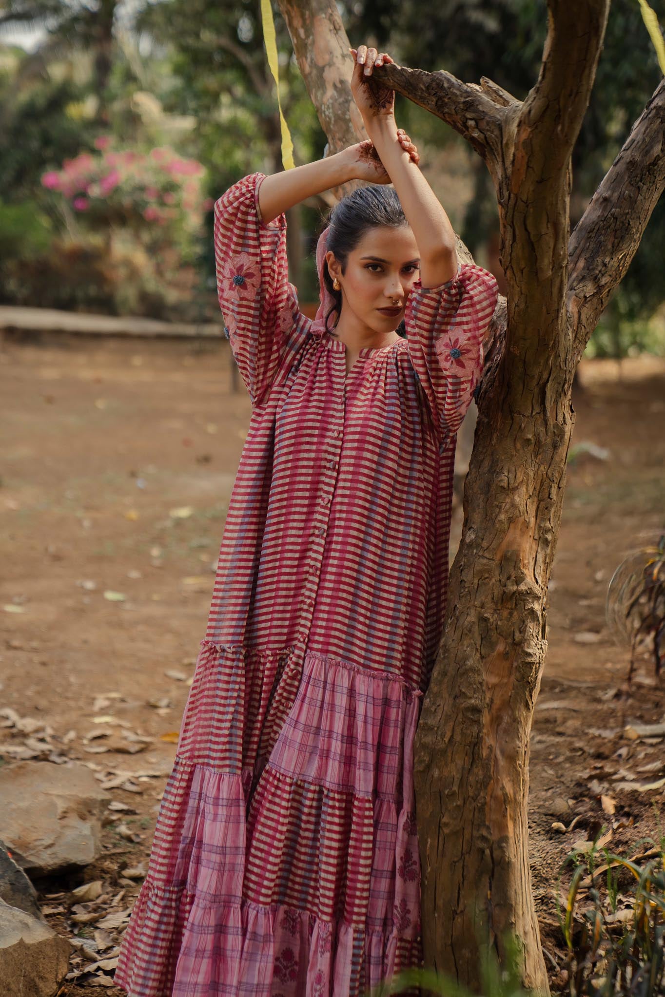 DESCRIPTION: Multi color hand block printed chanderi mul long dress has round neck with button placket. Sleeves has hand and macine embroidery. Dress has attached lining with pockets.