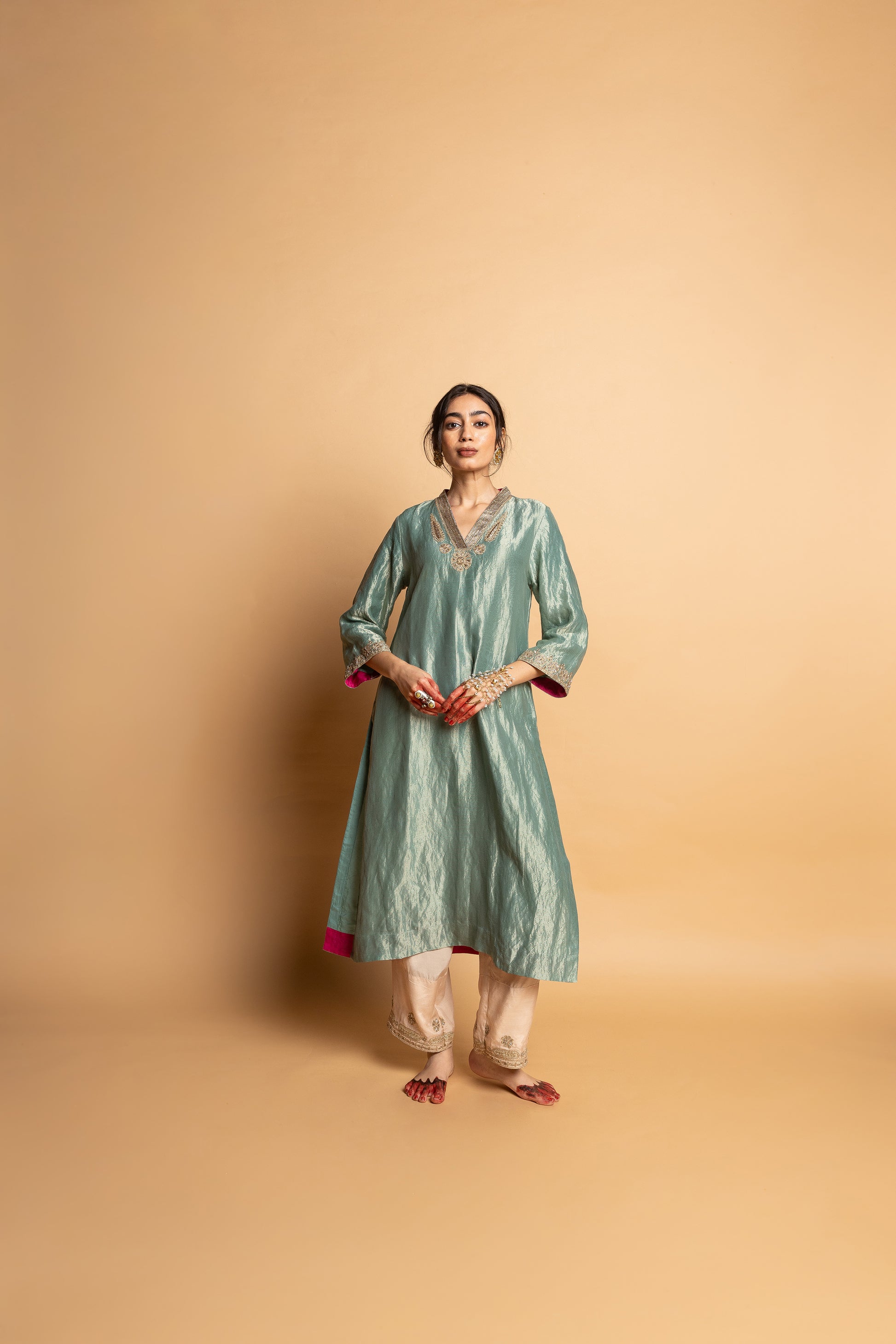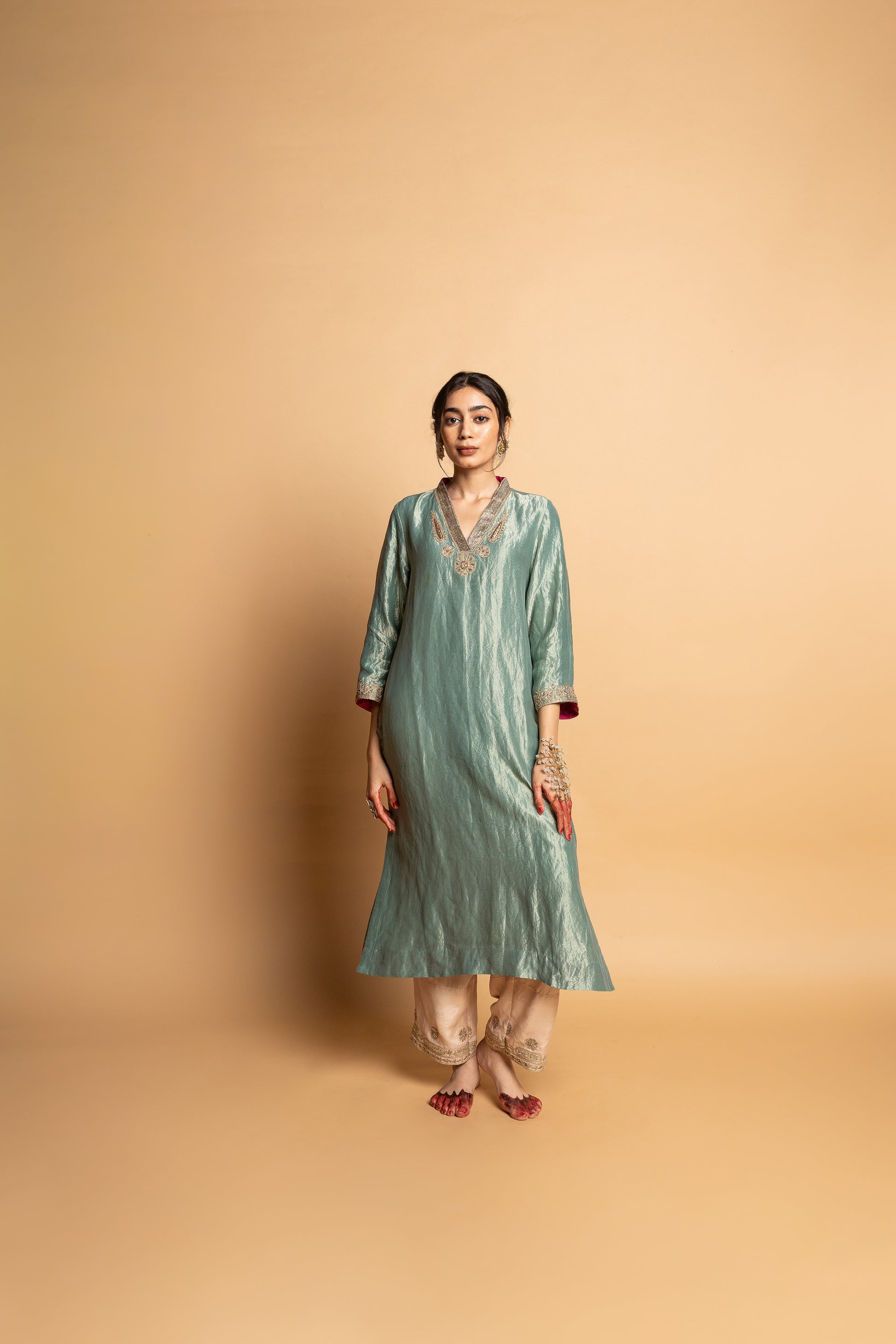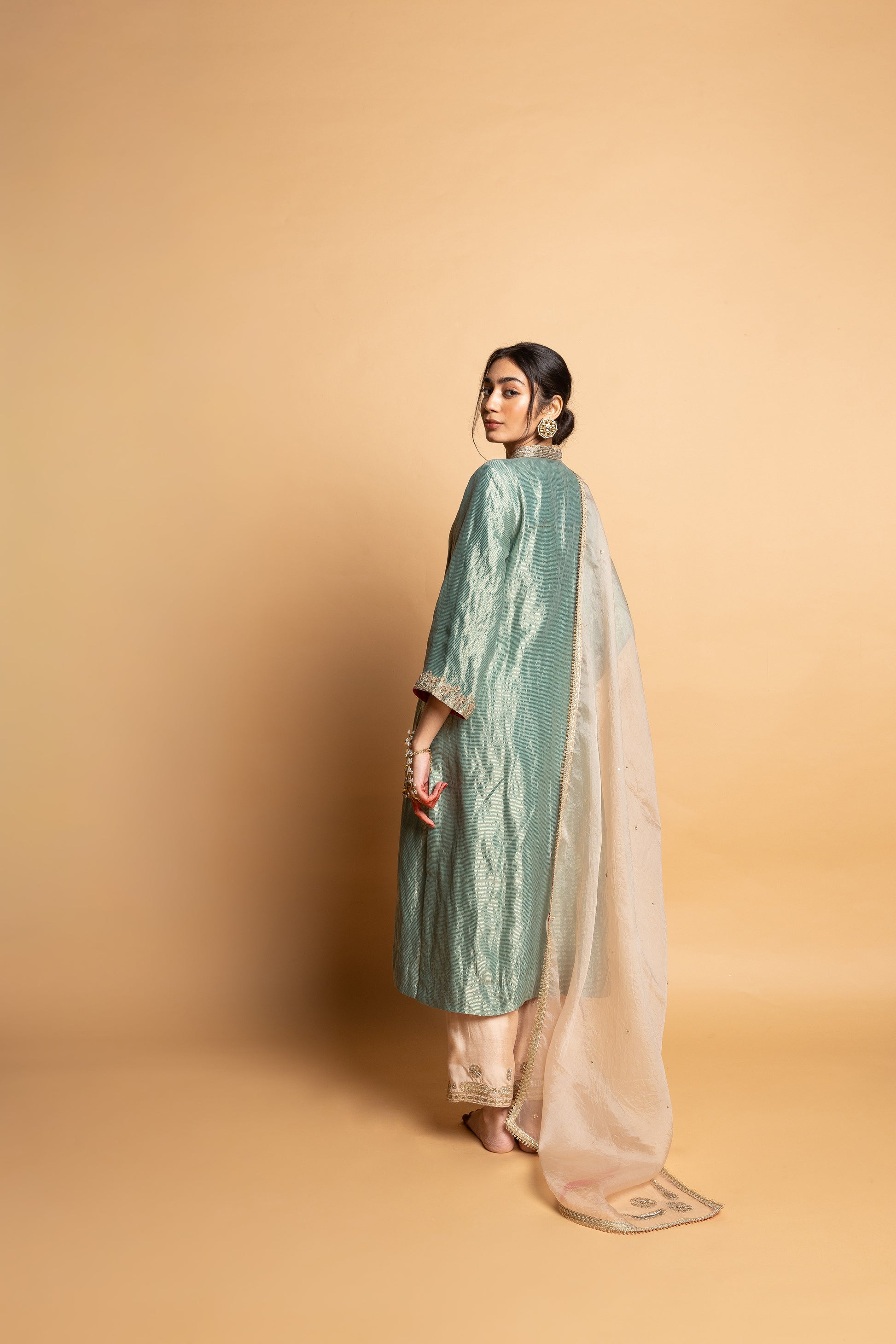 DESCRIPTION: Light aqua chanderi zari kurta has "V" neck with hand zardosi and machine embroidery. Sleeves are straight with hand and machine embroidery. Kurta has attched lining. Bottom are straight fit with hand and machine embroidery on the hem. Dupatta is of silk organza has hand embroidery and machine embroidery with gold lace border all around.